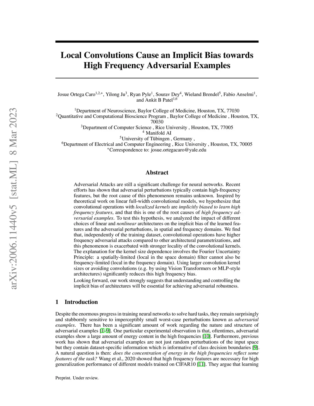 Adversarial Attacks are still a significant challenge for neural networks. Recent work has shown that adversarial perturbations typically contain high-frequency features, but the root cause of this phenomenon remains unknown. Inspired by theoretical work on linear full-width convolutional models, we hypothesize that the local (i.e. bounded-width) convolutional operations commonly used in current neural networks are implicitly biased to learn high frequency features, and that this is one of the root causes of high frequency adversarial examples. To test this hypothesis, we analyzed the impact of different choices of linear and nonlinear architectures on the implicit bias of the learned features and the adversarial perturbations, in both spatial and frequency domains. We find that the high-frequency adversarial perturbations are critically dependent on the convolution operation because the spatially-limited nature of local convolutions induces an implicit bias towards high frequency features. The explanation for the latter involves the Fourier Uncertainty Principle: a spatially-limited (local in the space domain) filter cannot also be frequency-limited (local in the frequency domain). Furthermore, using larger convolution kernel sizes or avoiding convolutions (e.g. by using Vision Transformers architecture) significantly reduces this high frequency bias, but not the overall susceptibility to attacks. Looking forward, our work strongly suggests that understanding and controlling the implicit bias of architectures will be essential for achieving adversarial robustness.