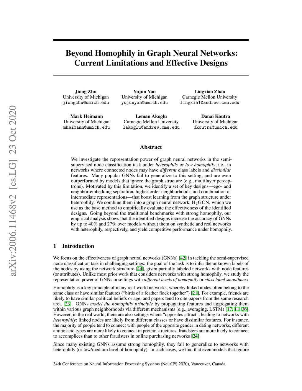 We investigate the representation power of graph neural networks in the semi-supervised node classification task under heterophily or low homophily, i.e., in networks where connected nodes may have different class labels and dissimilar features. Many popular GNNs fail to generalize to this setting, and are even outperformed by models that ignore the graph structure (e.g., multilayer perceptrons). Motivated by this limitation, we identify a set of key designs -- ego- and neighbor-embedding separation, higher-order neighborhoods, and combination of intermediate representations -- that boost learning from the graph structure under heterophily. We combine them into a graph neural network, H2GCN, which we use as the base method to empirically evaluate the effectiveness of the identified designs. Going beyond the traditional benchmarks with strong homophily, our empirical analysis shows that the identified designs increase the accuracy of GNNs by up to 40% and 27% over models without them on synthetic and real networks with heterophily, respectively, and yield competitive performance under homophily.