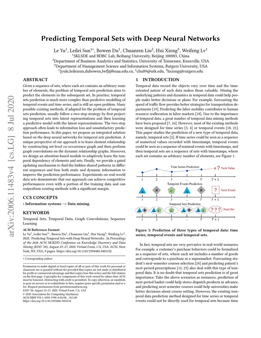 Given a sequence of sets, where each set contains an arbitrary number of elements, the problem of temporal sets prediction aims to predict the elements in the subsequent set. In practice, temporal sets prediction is much more complex than predictive modelling of temporal events and time series, and is still an open problem. Many possible existing methods, if adapted for the problem of temporal sets prediction, usually follow a two-step strategy by first projecting temporal sets into latent representations and then learning a predictive model with the latent representations. The two-step approach often leads to information loss and unsatisfactory prediction performance. In this paper, we propose an integrated solution based on the deep neural networks for temporal sets prediction. A unique perspective of our approach is to learn element relationship by constructing set-level co-occurrence graph and then perform graph convolutions on the dynamic relationship graphs. Moreover, we design an attention-based module to adaptively learn the temporal dependency of elements and sets. Finally, we provide a gated updating mechanism to find the hidden shared patterns in different sequences and fuse both static and dynamic information to improve the prediction performance. Experiments on real-world data sets demonstrate that our approach can achieve competitive performances even with a portion of the training data and can outperform existing methods with a significant margin.