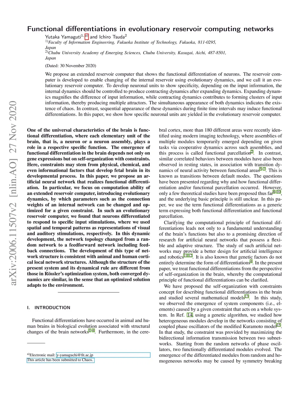 We propose an extended reservoir computer that shows the functional differentiation of neurons. The reservoir computer is developed to enable changing of the internal reservoir using evolutionary dynamics, and we call it an evolutionary reservoir computer. To develop neuronal units to show specificity, depending on the input information, the internal dynamics should be controlled to produce contracting dynamics after expanding dynamics. Expanding dynamics magnifies the difference of input information, while contracting dynamics contributes to forming clusters of input information, thereby producing multiple attractors. The simultaneous appearance of both dynamics indicates the existence of chaos. In contrast, sequential appearance of these dynamics during finite time intervals may induce functional differentiations. In this paper, we show how specific neuronal units are yielded in the evolutionary reservoir computer.
