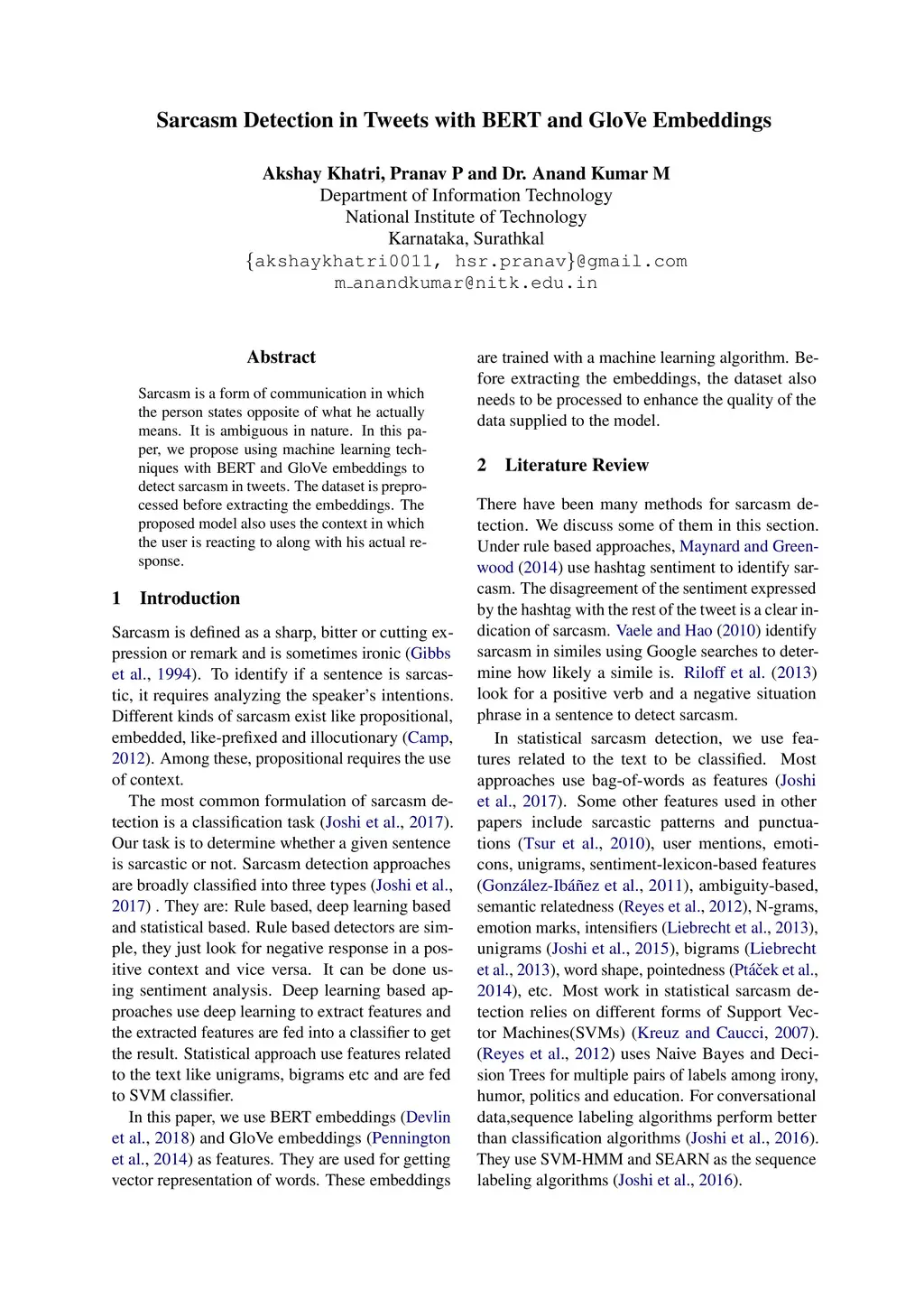 Sarcasm is a form of communication in whichthe person states opposite of what he actually means. It is ambiguous in nature. In this paper, we propose using machine learning techniques with BERT and GloVe embeddings to detect sarcasm in tweets. The dataset is preprocessed before extracting the embeddings. The proposed model also uses the context in which the user is reacting to along with his actual response.