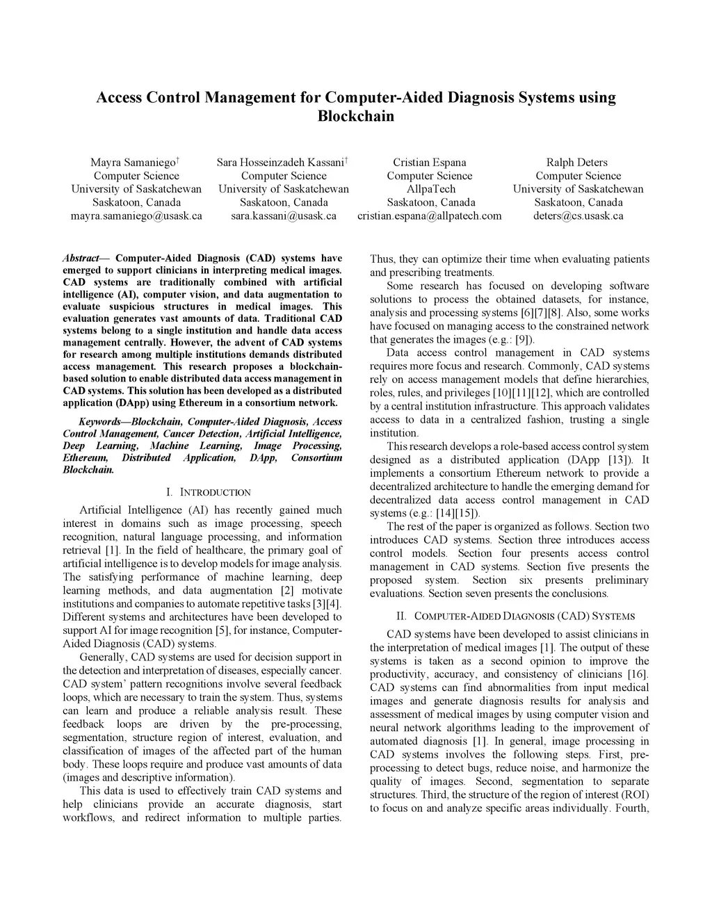 Computer-Aided Diagnosis (CAD) systems have emerged to support clinicians in interpreting medical images. CAD systems are traditionally combined with artificial intelligence (AI), computer vision, and data augmentation to evaluate suspicious structures in medical images. This evaluation generates vast amounts of data. Traditional CAD systems belong to a single institution and handle data access management centrally. However, the advent of CAD systems for research among multiple institutions demands distributed access management. This research proposes a blockchain-based solution to enable distributed data access management in CAD systems. This solution has been developed as a distributed application (DApp) using Ethereum in a consortium network.