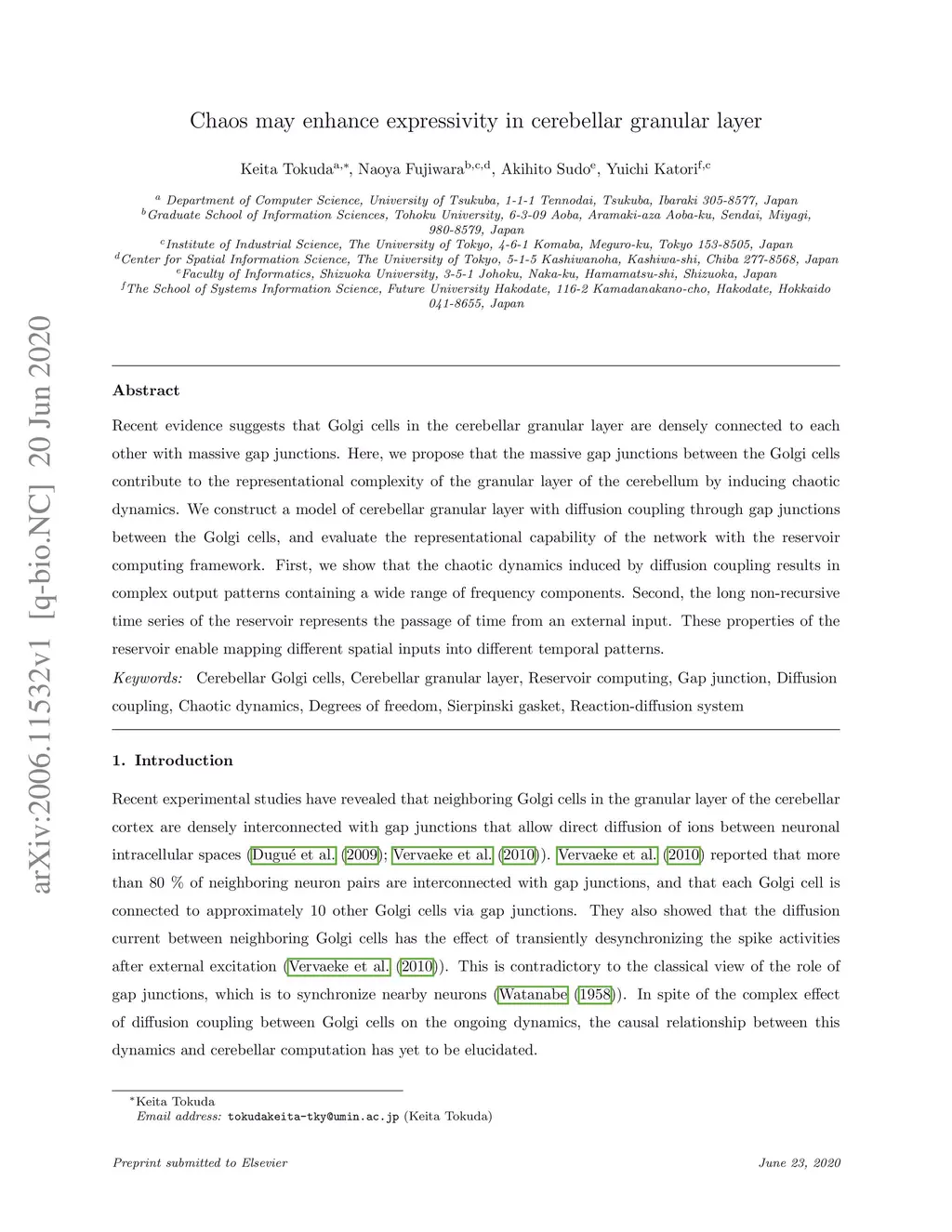 Recent evidence suggests that Golgi cells in the cerebellar granular layer are densely connected to each other with massive gap junctions. Here, we propose that the massive gap junctions between the Golgi cells contribute to the representational complexity of the granular layer of the cerebellum by inducing chaotic dynamics. We construct a model of cerebellar granular layer with diffusion coupling through gap junctions between the Golgi cells, and evaluate the representational capability of the network with the reservoir computing framework. First, we show that the chaotic dynamics induced by diffusion coupling results in complex output patterns containing a wide range of frequency components. Second, the long non-recursive time series of the reservoir represents the passage of time from an external input. These properties of the reservoir enable mapping different spatial inputs into different temporal patterns.