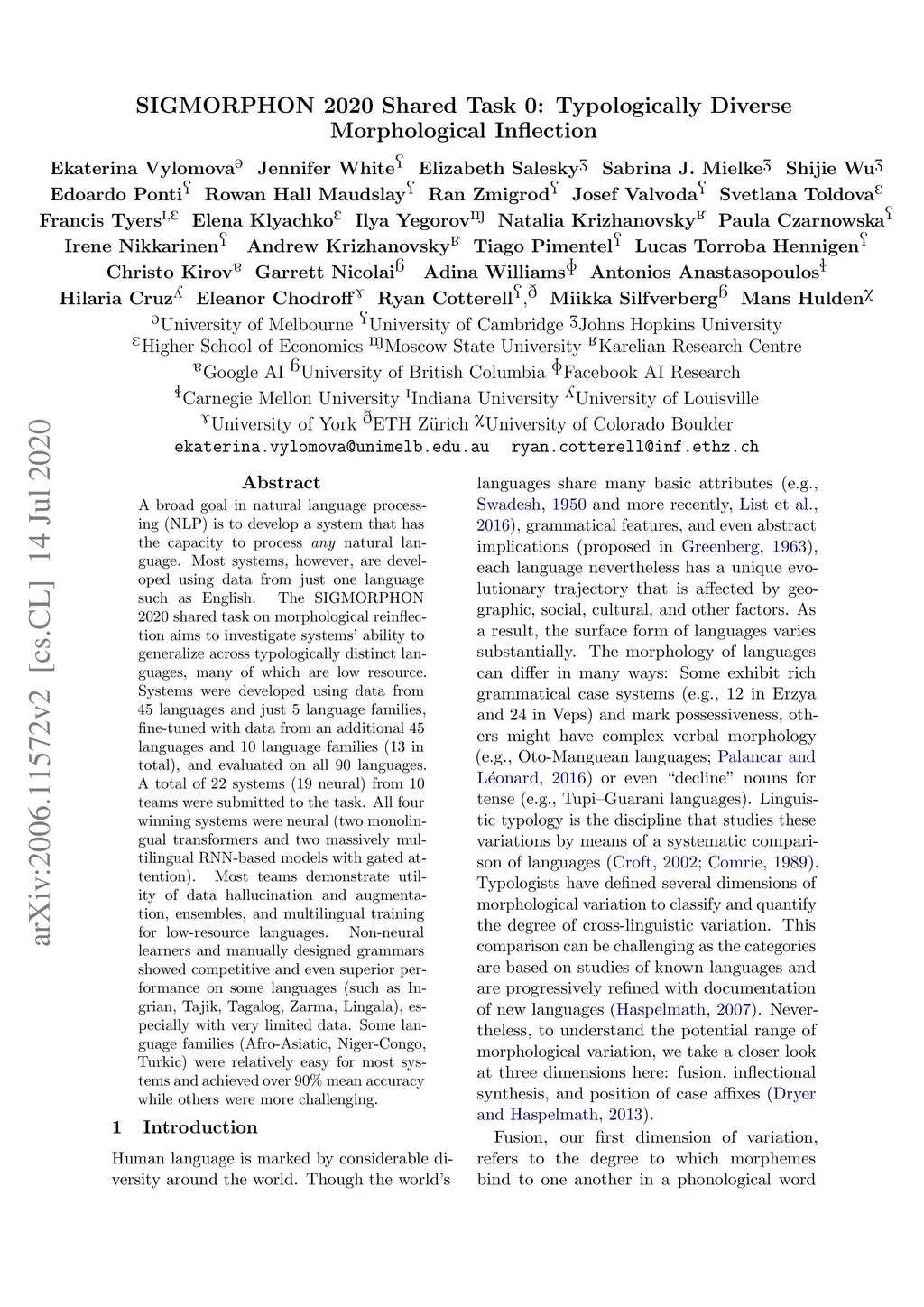 SIGMORPHON 2020 Shared Task 0: Typologically Diverse Morphological