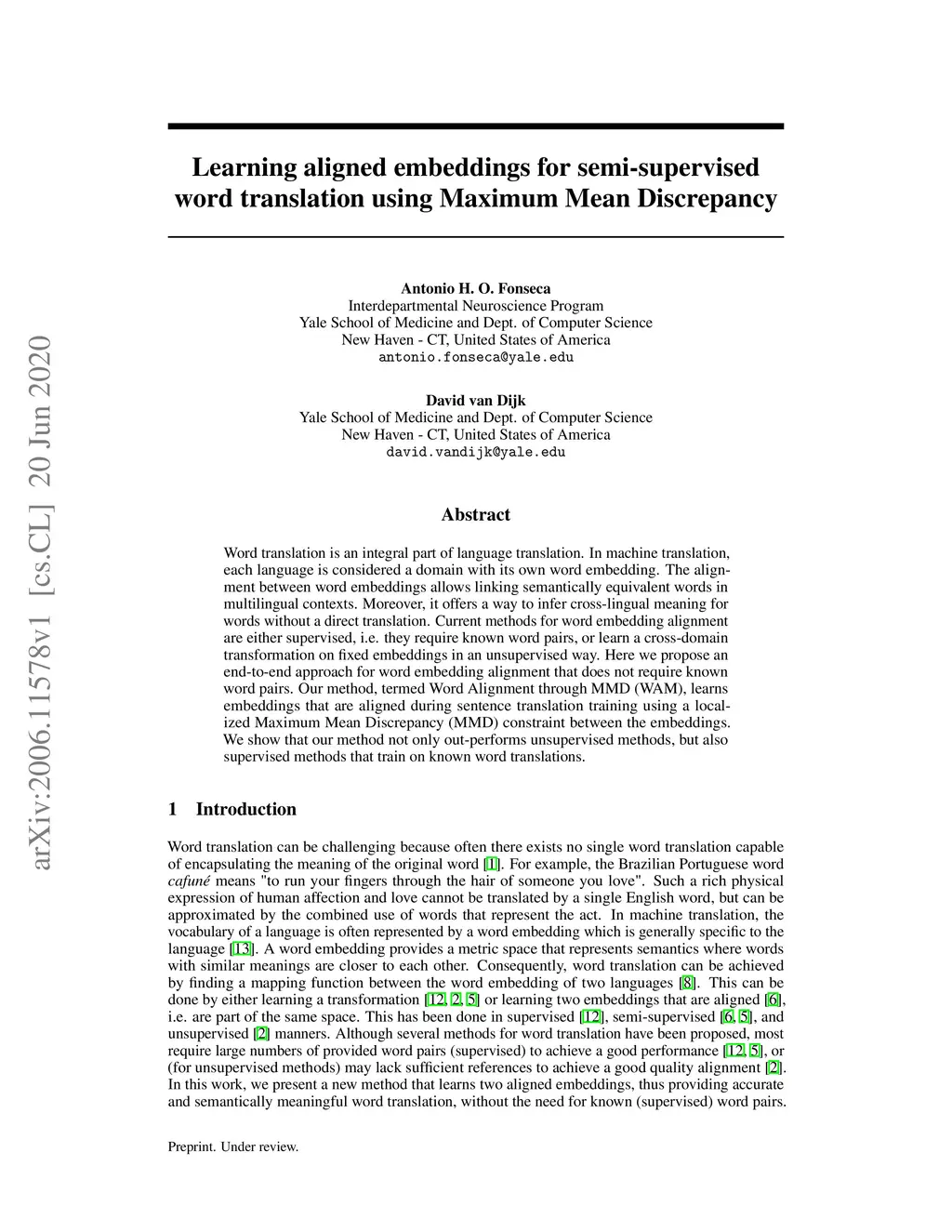 Word translation is an integral part of language translation. In machine translation, each language is considered a domain with its own word embedding. The alignment between word embeddings allows linking semantically equivalent words in multilingual contexts. Moreover, it offers a way to infer cross-lingual meaning for words without a direct translation. Current methods for word embedding alignment are either supervised, i.e. they require known word pairs, or learn a cross-domain transformation on fixed embeddings in an unsupervised way. Here we propose an end-to-end approach for word embedding alignment that does not require known word pairs. Our method, termed Word Alignment through MMD (WAM), learns embeddings that are aligned during sentence translation training using a localized Maximum Mean Discrepancy (MMD) constraint between the embeddings. We show that our method not only out-performs unsupervised methods, but also supervised methods that train on known word translations.
