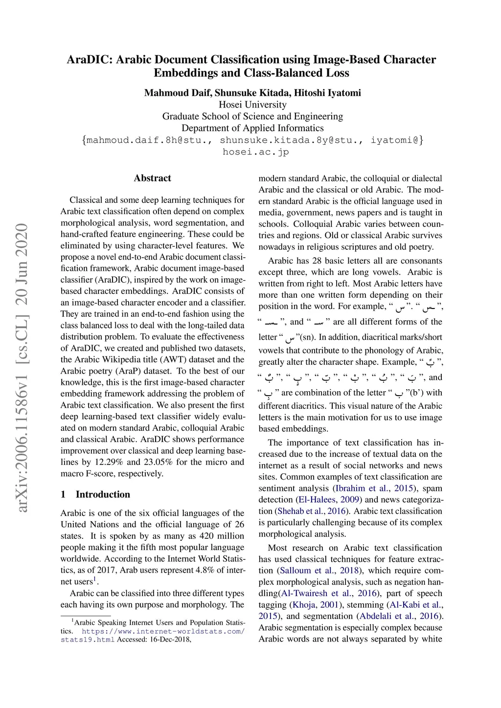 AraDIC: Arabic Document Classification using Image-Based Character