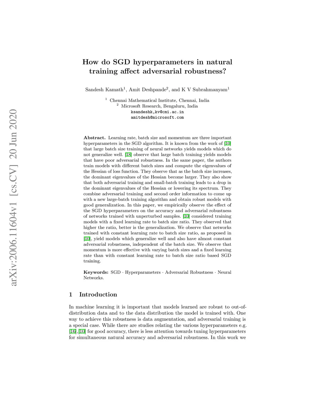 Learning rate, batch size and momentum are three important hyperparameters in the SGD algorithm. It is known from the work of Jastrzebski et al. arXiv:1711.04623 that large batch size training of neural networks yields models which do not generalize well. Yao et al. arXiv:1802.08241 observe that large batch training yields models that have poor adversarial robustness. In the same paper, the authors train models with different batch sizes and compute the eigenvalues of the Hessian of loss function. They observe that as the batch size increases, the dominant eigenvalues of the Hessian become larger. They also show that both adversarial training and small-batch training leads to a drop in the dominant eigenvalues of the Hessian or lowering its spectrum. They combine adversarial training and second order information to come up with a new large-batch training algorithm and obtain robust models with good generalization. In this paper, we empirically observe the effect of the SGD hyperparameters on the accuracy and adversarial robustness of networks trained with unperturbed samples. Jastrzebski et al. considered training models with a fixed learning rate to batch size ratio. They observed that higher the ratio, better is the generalization. We observe that networks trained with constant learning rate to batch size ratio, as proposed in Jastrzebski et al., yield models which generalize well and also have almost constant adversarial robustness, independent of the batch size. We observe that momentum is more effective with varying batch sizes and a fixed learning rate than with constant learning rate to batch size ratio based SGD training.