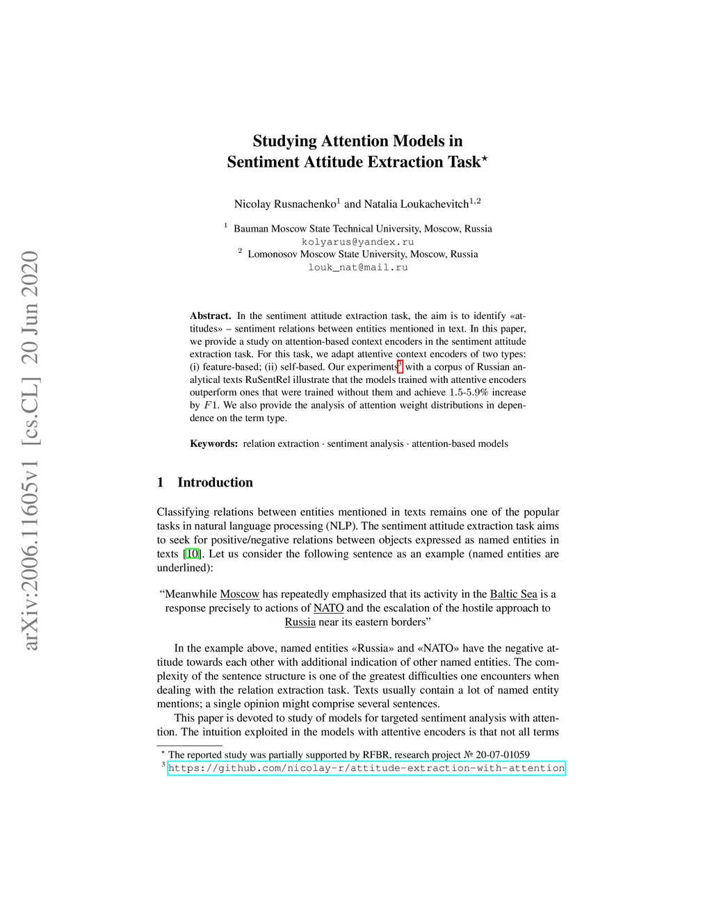 Studying Attention Models in Sentiment Attitude Extraction Task