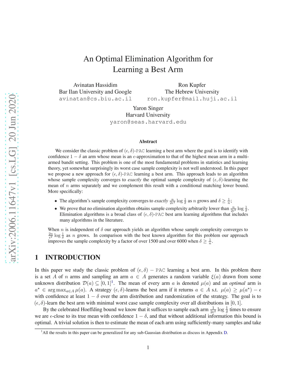An Optimal Elimination Algorithm for Learning a Best Arm