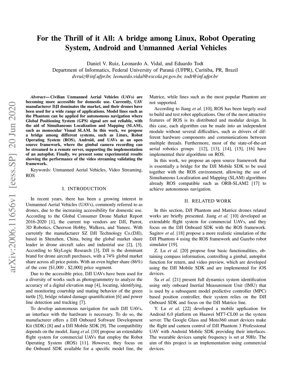 Civilian Unmanned Aerial Vehicles (UAVs) are becoming more accessible for domestic use. Currently, UAV manufacturer DJI dominates the market, and their drones have been used for a wide range of applications. Model lines such as the Phantom can be applied for autonomous navigation where Global Positioning System (GPS) signals are not reliable, with the aid of Simultaneous Localization and Mapping (SLAM), such as monocular Visual SLAM. In this work, we propose a bridge among different systems, such as Linux, Robot Operating System (ROS), Android, and UAVs as an open-source framework, where the gimbal camera recording can be streamed to a remote server, supporting the implementation of an autopilot. Finally, we present some experimental results showing the performance of the video streaming validating the framework.