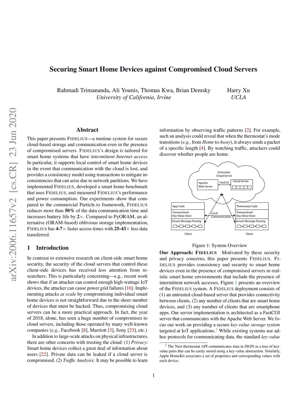 Smart home IoT systems often rely on cloud-based servers for communication between components. Although there exists a body of work on IoT security, most of it focuses on securing clients (i.e., IoT devices). However, cloud servers can also be compromised. Existing approaches do not typically protect smart home systems against compromised cloud servers. This paper presents FIDELIUS: a runtime system for secure cloud-based storage and communication even in the presence of compromised servers. FIDELIUS's design is tailored for smart home systems that have intermittent Internet access. In particular, it supports local control of smart home devices in the event that communication with the cloud is lost, and provides a consistency model using transactions to mitigate inconsistencies that can arise due to network partitions. We have implemented FIDELIUS, developed a smart home benchmark that uses FIDELIUS, and measured FIDELIUS's performance and power consumption. Our experiments show that compared to the commercial Particle.io framework, FIDELIUS reduces more than 50% of the data communication time and increases battery life by 2X. Compared to PyORAM, an alternative (ORAM-based) oblivious storage implementation, FIDELIUS has 4-7X faster access times with 25-43X less data transferred.