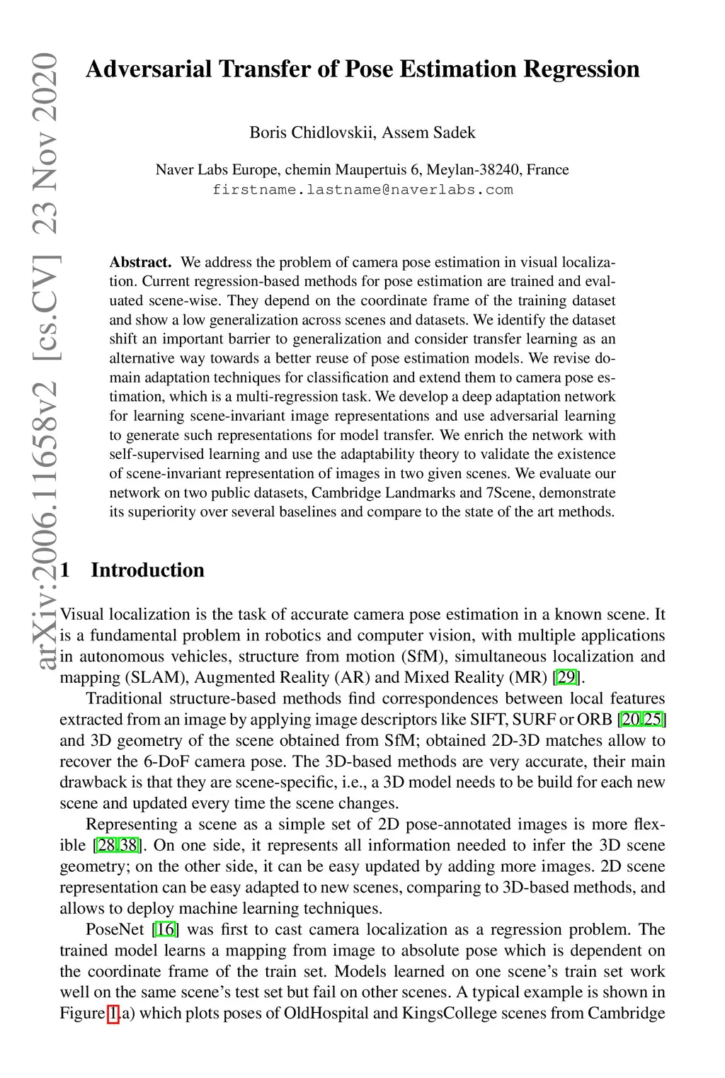We address the problem of camera pose estimation in visual localization. Current regression-based methods for pose estimation are trained and evaluated scene-wise. They depend on the coordinate frame of the training dataset and show a low generalization across scenes and datasets. We identify the dataset shift an important barrier to generalization and consider transfer learning as an alternative way towards a better reuse of pose estimation models. We revise domain adaptation techniques for classification and extend them to camera pose estimation, which is a multi-regression task. We develop a deep adaptation network for learning scene-invariant image representations and use adversarial learning to generate such representations for model transfer. We enrich the network with self-supervised learning and use the adaptability theory to validate the existence of scene-invariant representation of images in two given scenes. We evaluate our network on two public datasets, Cambridge Landmarks and 7Scene, demonstrate its superiority over several baselines and compare to the state of the art methods.