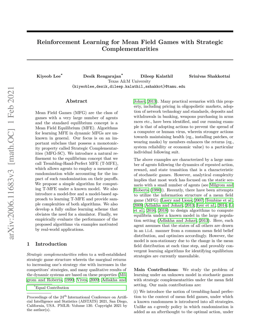 Mean Field Games (MFG) are the class of games with a very large number of agents and the standard equilibrium concept is a Mean Field Equilibrium (MFE). Algorithms for learning MFE in dynamic MFGs are unknown in general. Our focus is on an important subclass that possess a monotonicity property called Strategic Complementarities (MFG-SC). We introduce a natural refinement to the equilibrium concept that we call Trembling-Hand-Perfect MFE (T-MFE), which allows agents to employ a measure of randomization while accounting for the impact of such randomization on their payoffs. We propose a simple algorithm for computing T-MFE under a known model. We also introduce a model-free and a model-based approach to learning T-MFE and provide sample complexities of both algorithms. We also develop a fully online learning scheme that obviates the need for a simulator. Finally, we empirically evaluate the performance of the proposed algorithms via examples motivated by real-world applications.
