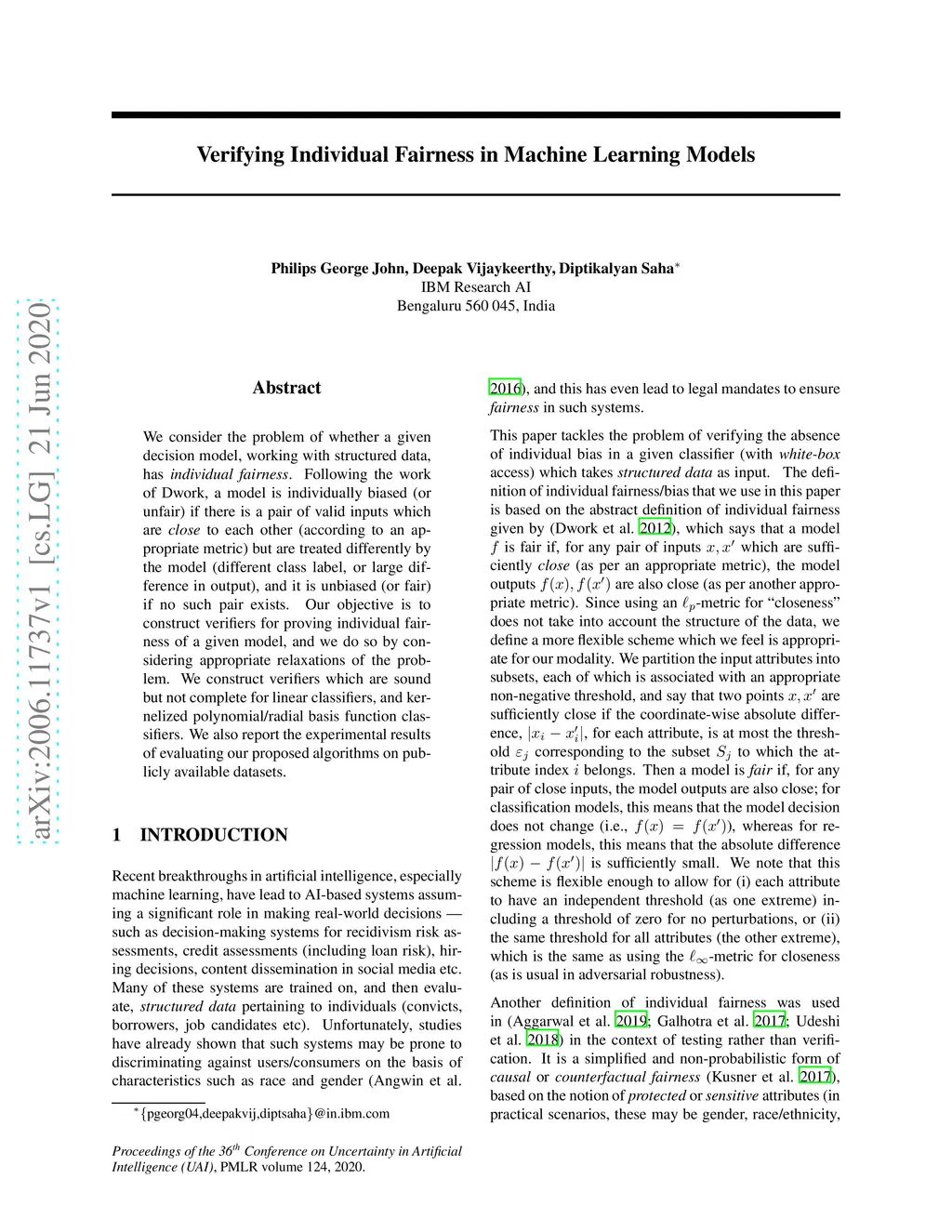 We consider the problem of whether a given decision model, working with structured data, has individual fairness. Following the work of Dwork, a model is individually biased (or unfair) if there is a pair of valid inputs which are close to each other (according to an appropriate metric) but are treated differently by the model (different class label, or large difference in output), and it is unbiased (or fair) if no such pair exists. Our objective is to construct verifiers for proving individual fairness of a given model, and we do so by considering appropriate relaxations of the problem. We construct verifiers which are sound but not complete for linear classifiers, and kernelized polynomial/radial basis function classifiers. We also report the experimental results of evaluating our proposed algorithms on publicly available datasets.