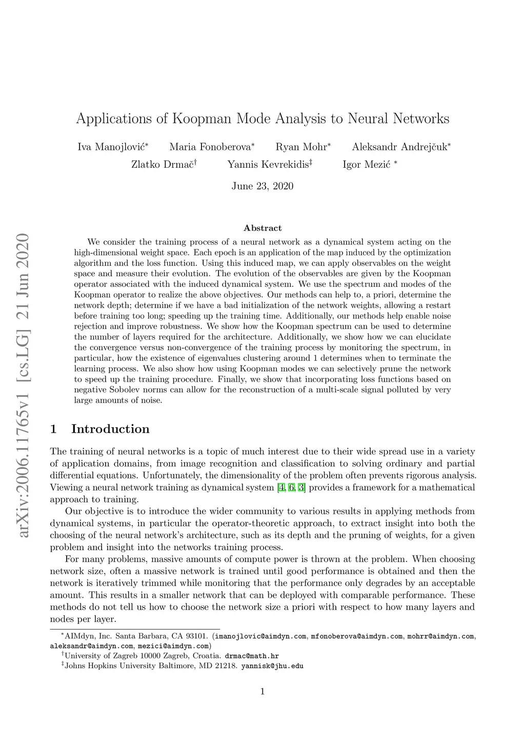 We consider the training process of a neural network as a dynamical system acting on the high-dimensional weight space. Each epoch is an application of the map induced by the optimization algorithm and the loss function. Using this induced map, we can apply observables on the weight space and measure their evolution. The evolution of the observables are given by the Koopman operator associated with the induced dynamical system. We use the spectrum and modes of the Koopman operator to realize the above objectives. Our methods can help to, a priori, determine the network depth; determine if we have a bad initialization of the network weights, allowing a restart before training too long; speeding up the training time. Additionally, our methods help enable noise rejection and improve robustness. We show how the Koopman spectrum can be used to determine the number of layers required for the architecture. Additionally, we show how we can elucidate the convergence versus non-convergence of the training process by monitoring the spectrum, in particular, how the existence of eigenvalues clustering around 1 determines when to terminate the learning process. We also show how using Koopman modes we can selectively prune the network to speed up the training procedure. Finally, we show that incorporating loss functions based on negative Sobolev norms can allow for the reconstruction of a multi-scale signal polluted by very large amounts of noise.