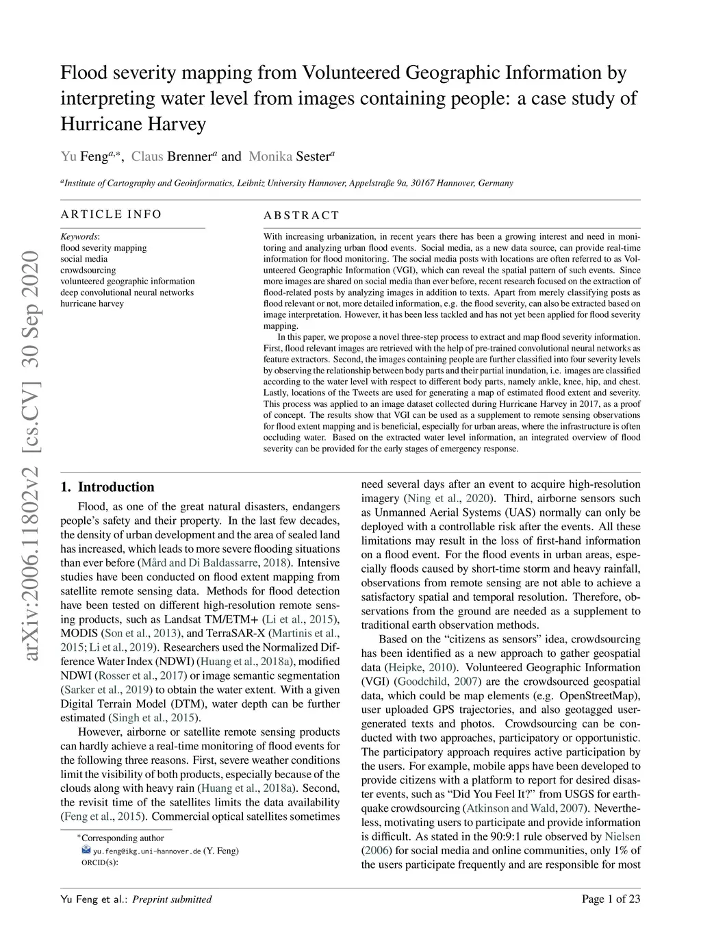 With increasing urbanization, in recent years there has been a growing interest and need in monitoring and analyzing urban flood events. Social media, as a new data source, can provide real-time information for flood monitoring. The social media posts with locations are often referred to as Volunteered Geographic Information (VGI), which can reveal the spatial pattern of such events. Since more images are shared on social media than ever before, recent research focused on the extraction of flood-related posts by analyzing images in addition to texts. Apart from merely classifying posts as flood relevant or not, more detailed information, e.g. the flood severity, can also be extracted based on image interpretation. However, it has been less tackled and has not yet been applied for flood severity mapping. In this paper, we propose a novel three-step process to extract and map flood severity information. First, flood relevant images are retrieved with the help of pre-trained convolutional neural networks as feature extractors. Second, the images containing people are further classified into four severity levels by observing the relationship between body parts and their partial inundation, i.e. images are classified according to the water level with respect to different body parts, namely ankle, knee, hip, and chest. Lastly, locations of the Tweets are used for generating a map of estimated flood extent and severity. This process was applied to an image dataset collected during Hurricane Harvey in 2017, as a proof of concept. The results show that VGI can be used as a supplement to remote sensing observations for flood extent mapping and is beneficial, especially for urban areas, where the infrastructure is often occluding water. Based on the extracted water level information, an integrated overview of flood severity can be provided for the early stages of emergency response.