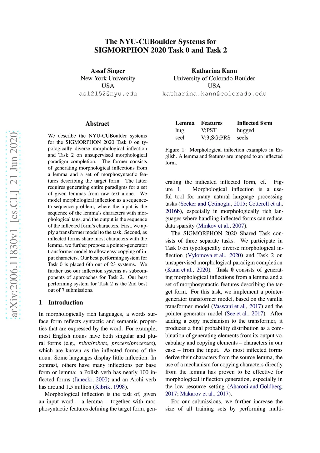 We describe the NYU-CUBoulder systems for the SIGMORPHON 2020 Task 0 on typologically diverse morphological inflection and Task 2 on unsupervised morphological paradigm completion. The former consists of generating morphological inflections from a lemma and a set of morphosyntactic features describing the target form. The latter requires generating entire paradigms for a set of given lemmas from raw text alone. We model morphological inflection as a sequence-to-sequence problem, where the input is the sequence of the lemma's characters with morphological tags, and the output is the sequence of the inflected form's characters. First, we apply a transformer model to the task. Second, as inflected forms share most characters with the lemma, we further propose a pointer-generator transformer model to allow easy copying of input characters. Our best performing system for Task 0 is placed 6th out of 23 systems. We further use our inflection systems as subcomponents of approaches for Task 2. Our best performing system for Task 2 is the 2nd best out of 7 submissions.