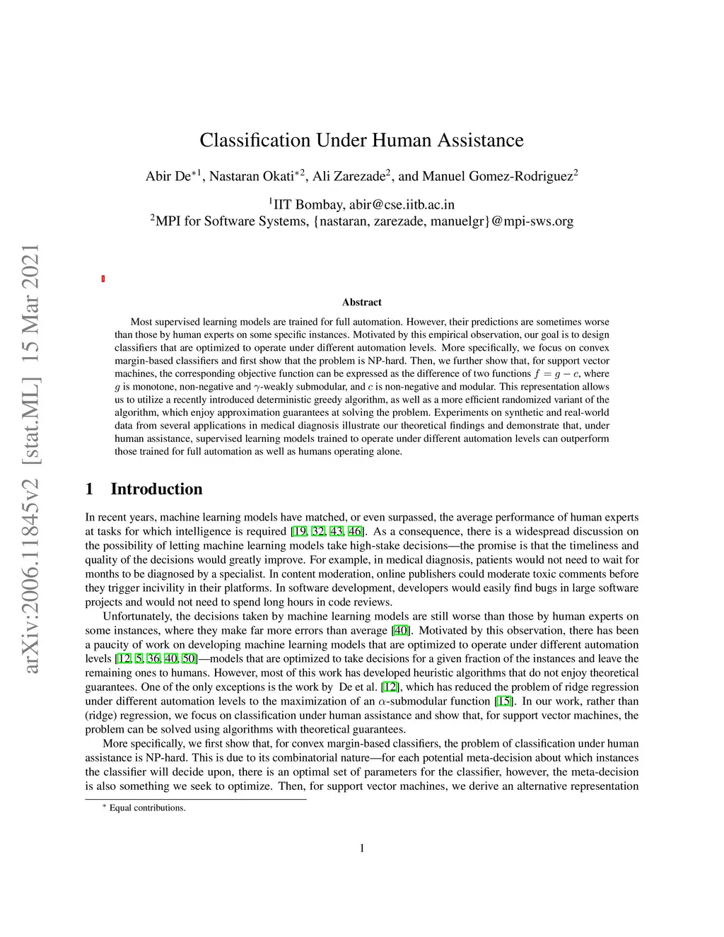 Most supervised learning models are trained for full automation. However, their predictions are sometimes worse than those by human experts on some specific instances. Motivated by this empirical observation, our goal is to design classifiers that are optimized to operate under different automation levels. More specifically, we focus on convex margin-based classifiers and first show that the problem is NP-hard. Then, we further show that, for support vector machines, the corresponding objective function can be expressed as the difference of two functions f = g - c, where g is monotone, non-negative and {\gamma}-weakly submodular, and c is non-negative and modular. This representation allows a recently introduced deterministic greedy algorithm, as well as a more efficient randomized variant of the algorithm, to enjoy approximation guarantees at solving the problem. Experiments on synthetic and real-world data from several applications in medical diagnosis illustrate our theoretical findings and demonstrate that, under human assistance, supervised learning models trained to operate under different automation levels can outperform those trained for full automation as well as humans operating alone.