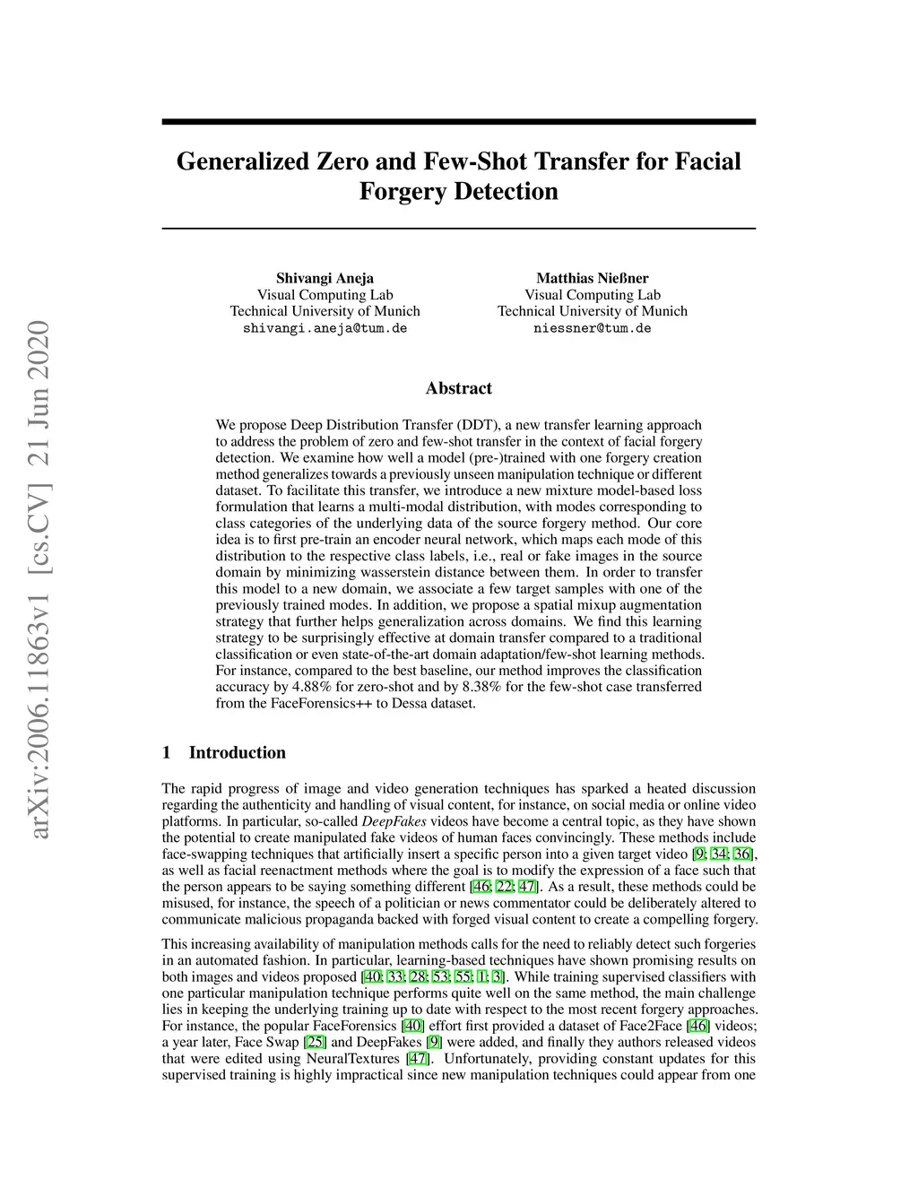 We propose Deep Distribution Transfer(DDT), a new transfer learning approach to address the problem of zero and few-shot transfer in the context of facial forgery detection. We examine how well a model (pre-)trained with one forgery creation method generalizes towards a previously unseen manipulation technique or different dataset. To facilitate this transfer, we introduce a new mixture model-based loss formulation that learns a multi-modal distribution, with modes corresponding to class categories of the underlying data of the source forgery method. Our core idea is to first pre-train an encoder neural network, which maps each mode of this distribution to the respective class labels, i.e., real or fake images in the source domain by minimizing wasserstein distance between them. In order to transfer this model to a new domain, we associate a few target samples with one of the previously trained modes. In addition, we propose a spatial mixup augmentation strategy that further helps generalization across domains. We find this learning strategy to be surprisingly effective at domain transfer compared to a traditional classification or even state-of-the-art domain adaptation/few-shot learning methods. For instance, compared to the best baseline, our method improves the classification accuracy by 4.88% for zero-shot and by 8.38% for the few-shot case transferred from the FaceForensics++ to Dessa dataset.