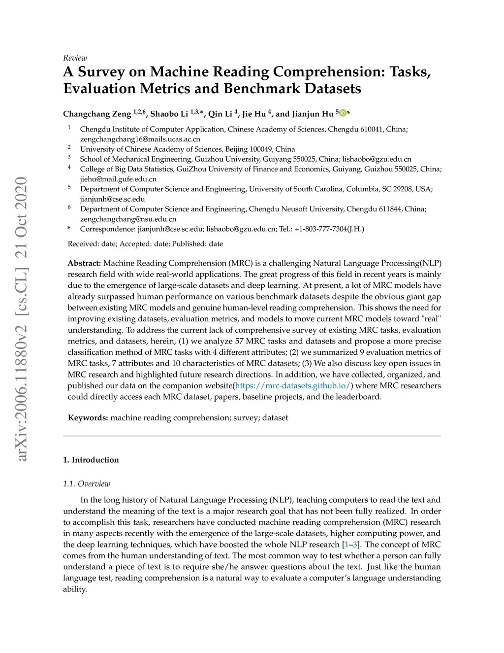 Machine Reading Comprehension (MRC) is a challenging Natural Language Processing(NLP) research field with wide real-world applications. The great progress of this field in recent years is mainly due to the emergence of large-scale datasets and deep learning. At present, a lot of MRC models have already surpassed human performance on various benchmark datasets despite the obvious giant gap between existing MRC models and genuine human-level reading comprehension. This shows the need for improving existing datasets, evaluation metrics, and models to move current MRC models toward "real" understanding. To address the current lack of comprehensive survey of existing MRC tasks, evaluation metrics, and datasets, herein, (1) we analyze 57 MRC tasks and datasets and propose a more precise classification method of MRC tasks with 4 different attributes; (2) we summarized 9 evaluation metrics of MRC tasks, 7 attributes and 10 characteristics of MRC datasets; (3) We also discuss key open issues in MRC research and highlighted future research directions. In addition, we have collected, organized, and published our data on the companion website(https://mrc-datasets.github.io/) where MRC researchers could directly access each MRC dataset, papers, baseline projects, and the leaderboard.