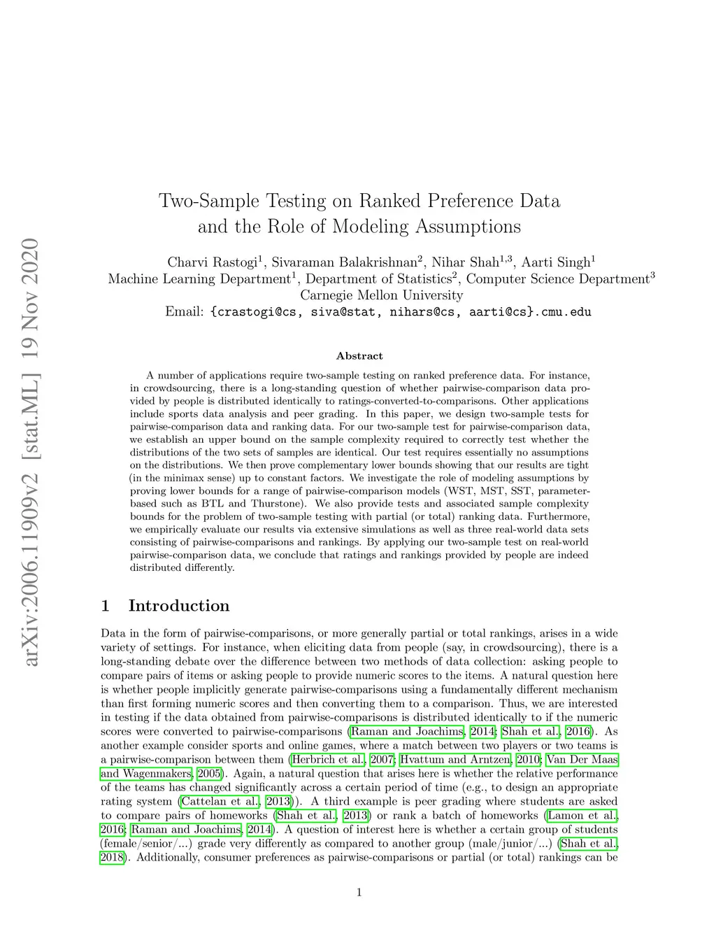 A number of applications require two-sample testing on ranked preference data. For instance, in crowdsourcing, there is a long-standing question of whether pairwise comparison data provided by people is distributed similar to ratings-converted-to-comparisons. Other examples include sports data analysis and peer grading. In this paper, we design two-sample tests for pairwise comparison data and ranking data. For our two-sample test for pairwise comparison data, we establish an upper bound on the sample complexity required to correctly distinguish between the distributions of the two sets of samples. Our test requires essentially no assumptions on the distributions. We then prove complementary lower bounds showing that our results are tight (in the minimax sense) up to constant factors. We investigate the role of modeling assumptions by proving lower bounds for a range of pairwise comparison models (WST, MST,SST, parameter-based such as BTL and Thurstone). We also provide testing algorithms and associated sample complexity bounds for the problem of two-sample testing with partial (or total) ranking data.Furthermore, we empirically evaluate our results via extensive simulations as well as two real-world datasets consisting of pairwise comparisons. By applying our two-sample test on real-world pairwise comparison data, we conclude that ratings and rankings provided by people are indeed distributed differently. On the other hand, our test recognizes no significant difference in the relative performance of European football teams across two seasons. Finally, we apply our two-sample test on a real-world partial and total ranking dataset and find a statistically significant difference in Sushi preferences across demographic divisions based on gender, age and region of residence.