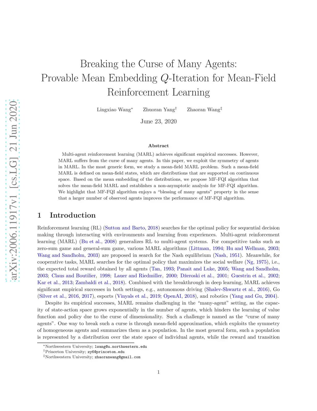 Multi-agent reinforcement learning (MARL) achieves significant empirical successes. However, MARL suffers from the curse of many agents. In this paper, we exploit the symmetry of agents in MARL. In the most generic form, we study a mean-field MARL problem. Such a mean-field MARL is defined on mean-field states, which are distributions that are supported on continuous space. Based on the mean embedding of the distributions, we propose MF-FQI algorithm that solves the mean-field MARL and establishes a non-asymptotic analysis for MF-FQI algorithm. We highlight that MF-FQI algorithm enjoys a "blessing of many agents" property in the sense that a larger number of observed agents improves the performance of MF-FQI algorithm.