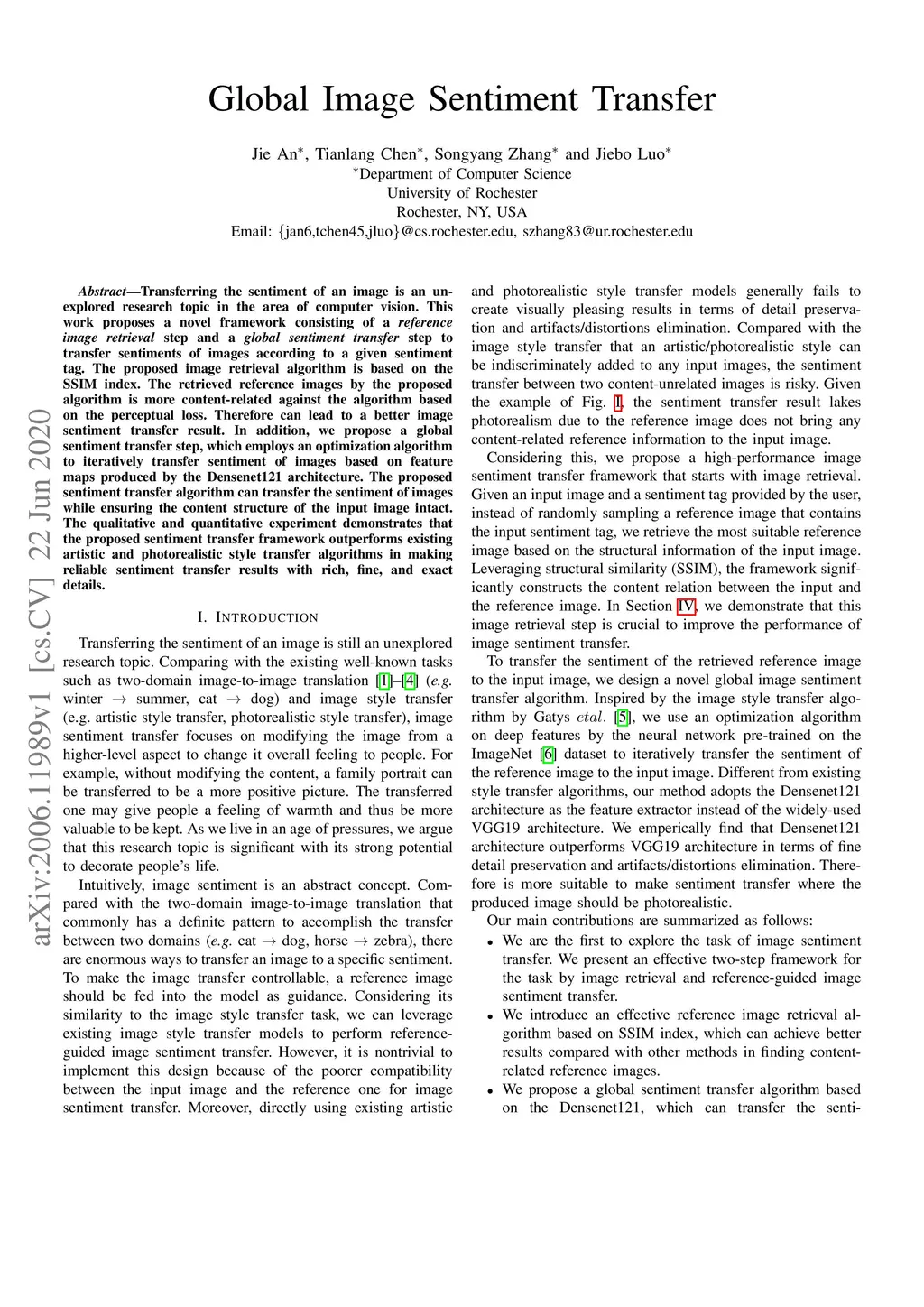 Transferring the sentiment of an image is an unexplored research topic in the area of computer vision. This work proposes a novel framework consisting of a reference image retrieval step and a global sentiment transfer step to transfer sentiments of images according to a given sentiment tag. The proposed image retrieval algorithm is based on the SSIM index. The retrieved reference images by the proposed algorithm are more content-related against the algorithm based on the perceptual loss. Therefore can lead to a better image sentiment transfer result. In addition, we propose a global sentiment transfer step, which employs an optimization algorithm to iteratively transfer sentiment of images based on feature maps produced by the Densenet121 architecture. The proposed sentiment transfer algorithm can transfer the sentiment of images while ensuring the content structure of the input image intact. The qualitative and quantitative experiments demonstrate that the proposed sentiment transfer framework outperforms existing artistic and photorealistic style transfer algorithms in making reliable sentiment transfer results with rich and exact details.
