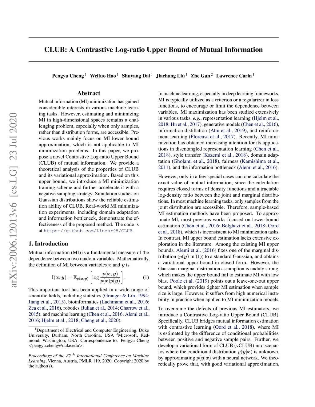 Mutual information (MI) minimization has gained considerable interests in various machine learning tasks. However, estimating and minimizing MI in high-dimensional spaces remains a challenging problem, especially when only samples, rather than distribution forms, are accessible. Previous works mainly focus on MI lower bound approximation, which is not applicable to MI minimization problems. In this paper, we propose a novel Contrastive Log-ratio Upper Bound (CLUB) of mutual information. We provide a theoretical analysis of the properties of CLUB and its variational approximation. Based on this upper bound, we introduce a MI minimization training scheme and further accelerate it with a negative sampling strategy. Simulation studies on Gaussian distributions show the reliable estimation ability of CLUB. Real-world MI minimization experiments, including domain adaptation and information bottleneck, demonstrate the effectiveness of the proposed method. The code is at https://github.com/Linear95/CLUB.