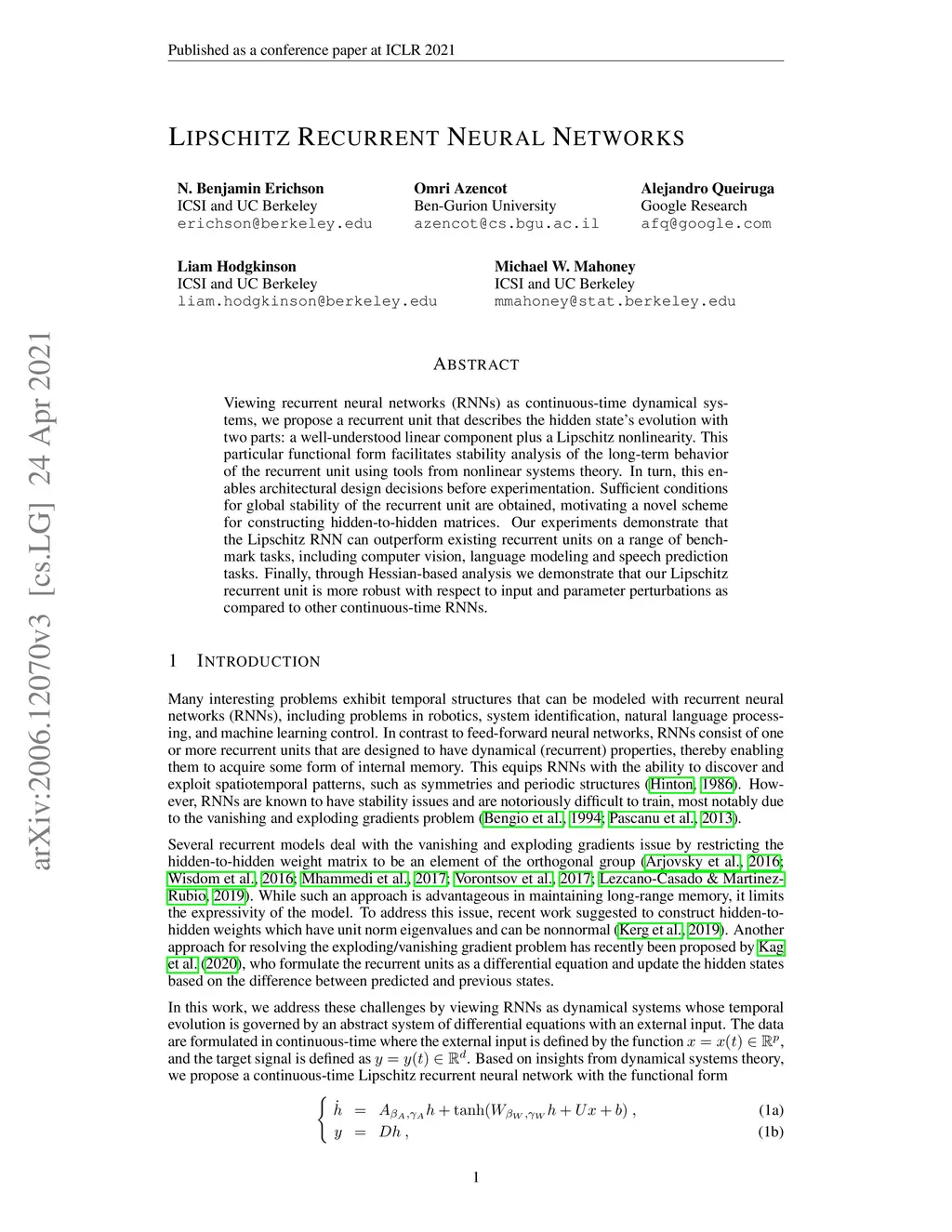 Lipschitz Recurrent Neural Networks