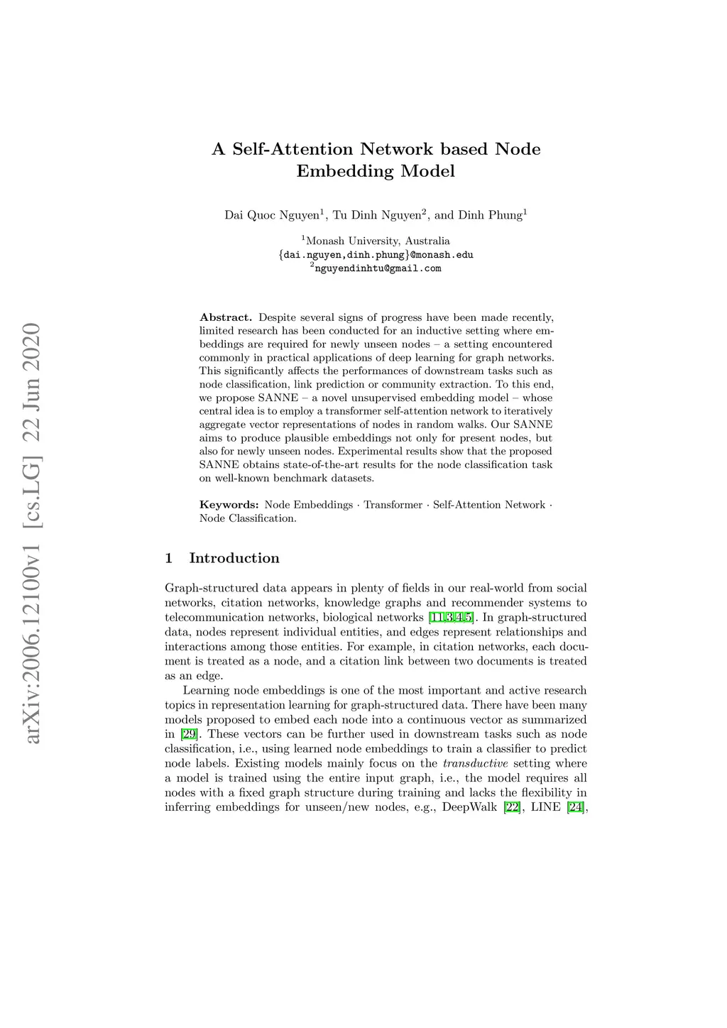 Despite several signs of progress have been made recently, limited research has been conducted for an inductive setting where embeddings are required for newly unseen nodes -- a setting encountered commonly in practical applications of deep learning for graph networks. This significantly affects the performances of downstream tasks such as node classification, link prediction or community extraction. To this end, we propose SANNE -- a novel unsupervised embedding model -- whose central idea is to employ a transformer self-attention network to iteratively aggregate vector representations of nodes in random walks. Our SANNE aims to produce plausible embeddings not only for present nodes, but also for newly unseen nodes. Experimental results show that the proposed SANNE obtains state-of-the-art results for the node classification task on well-known benchmark datasets.