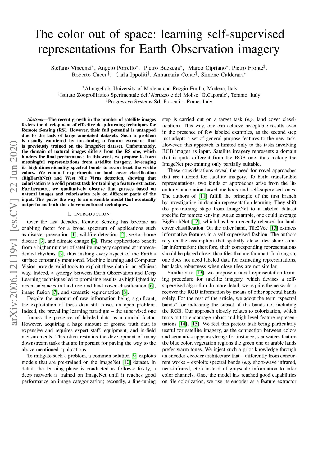 The recent growth in the number of satellite images fosters the development of effective deep-learning techniques for Remote Sensing (RS). However, their full potential is untapped due to the lack of large annotated datasets. Such a problem is usually countered by fine-tuning a feature extractor that is previously trained on the ImageNet dataset. Unfortunately, the domain of natural images differs from the RS one, which hinders the final performance. In this work, we propose to learn meaningful representations from satellite imagery, leveraging its high-dimensionality spectral bands to reconstruct the visible colors. We conduct experiments on land cover classification (BigEarthNet) and West Nile Virus detection, showing that colorization is a solid pretext task for training a feature extractor. Furthermore, we qualitatively observe that guesses based on natural images and colorization rely on different parts of the input. This paves the way to an ensemble model that eventually outperforms both the above-mentioned techniques.