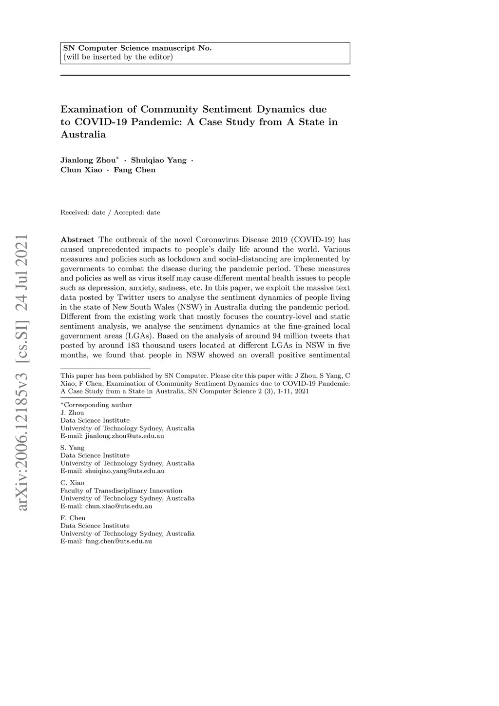 The outbreak of the novel Coronavirus Disease 2019 (COVID-19) has caused unprecedented impacts to people's daily life around the world. Various measures and policies such as lockdown and social-distancing are implemented by governments to combat the disease during the pandemic period. These measures and policies as well as virus itself may cause different mental health issues to people such as depression, anxiety, sadness, etc. In this paper, we exploit the massive text data posted by Twitter users to analyse the sentiment dynamics of people living in the state of New South Wales (NSW) in Australia during the pandemic period. Different from the existing work that mostly focuses the country-level and static sentiment analysis, we analyse the sentiment dynamics at the fine-grained local government areas (LGAs). Based on the analysis of around 94 million tweets that posted by around 183 thousand users located at different LGAs in NSW in five months, we found that people in NSW showed an overall positive sentimental polarity and the COVID-19 pandemic decreased the overall positive sentimental polarity during the pandemic period. The fine-grained analysis of sentiment in LGAs found that despite the dominant positive sentiment most of days during the study period, some LGAs experienced significant sentiment changes from positive to negative. This study also analysed the sentimental dynamics delivered by the hot topics in Twitter such as government policies (e.g. the Australia's JobKeeper program, lockdown, social-distancing) as well as the focused social events (e.g. the Ruby Princess Cruise). The results showed that the policies and events did affect people's overall sentiment, and they affected people's overall sentiment differently at different stages.