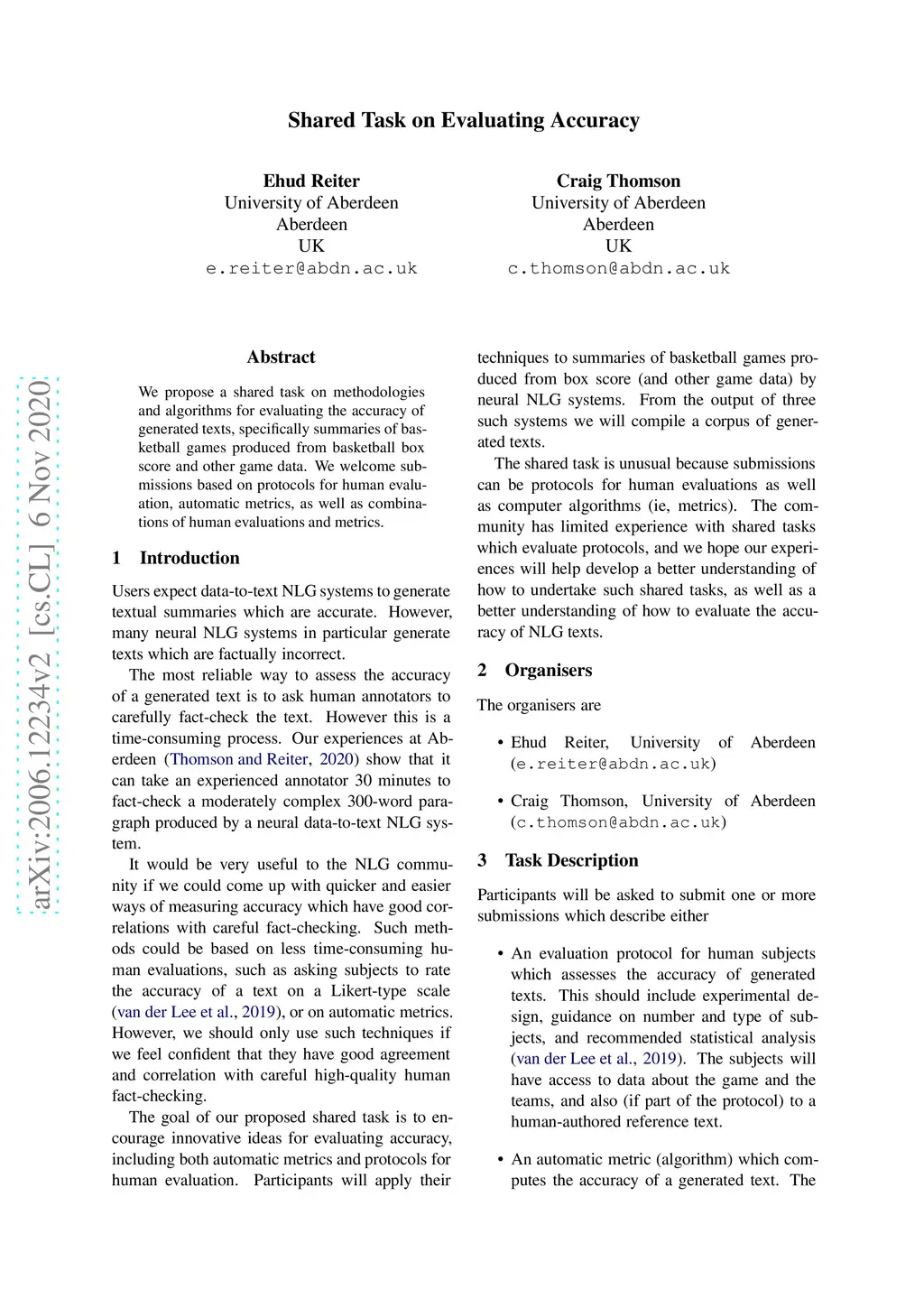 We propose a shared task on methodologies and algorithms for evaluating the accuracy of generated texts. Participants will measure the accuracy of basketball game summaries produced by NLG systems from basketball box score data.
