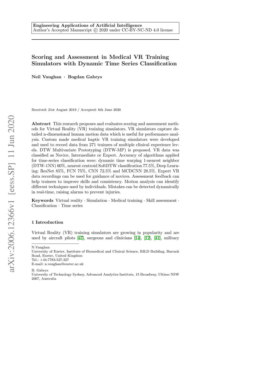 This research proposes and evaluates scoring and assessment methods for Virtual Reality (VR) training simulators. VR simulators capture detailed n-dimensional human motion data which is useful for performance analysis. Custom made medical haptic VR training simulators were developed and used to record data from 271 trainees of multiple clinical experience levels. DTW Multivariate Prototyping (DTW-MP) is proposed. VR data was classified as Novice, Intermediate or Expert. Accuracy of algorithms applied for time-series classification were: dynamic time warping 1-nearest neighbor (DTW-1NN) 60%, nearest centroid SoftDTW classification 77.5%, Deep Learning: ResNet 85%, FCN 75%, CNN 72.5% and MCDCNN 28.5%. Expert VR data recordings can be used for guidance of novices. Assessment feedback can help trainees to improve skills and consistency. Motion analysis can identify different techniques used by individuals. Mistakes can be detected dynamically in real-time, raising alarms to prevent injuries.