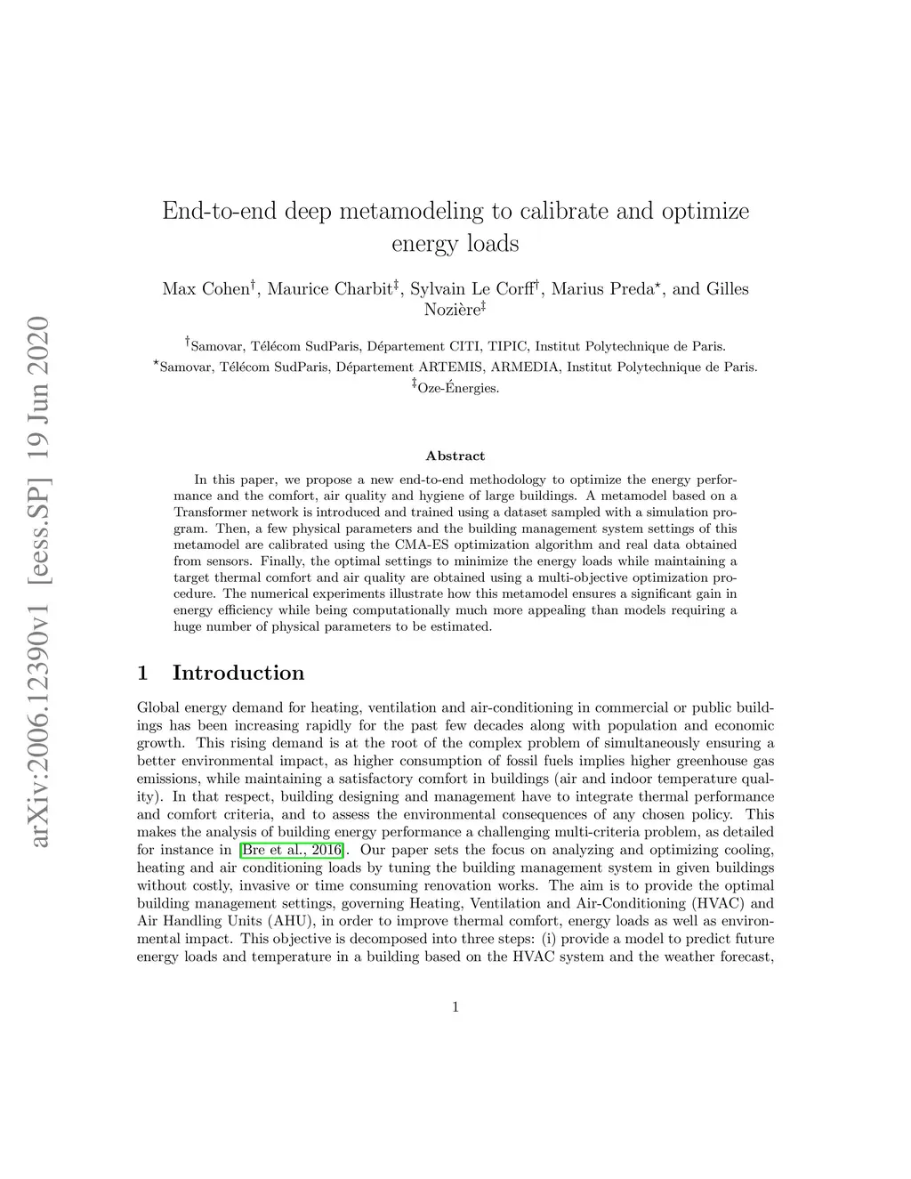 In this paper, we propose a new end-to-end methodology to optimize the energy performance and the comfort, air quality and hygiene of large buildings. A metamodel based on a Transformer network is introduced and trained using a dataset sampled with a simulation program. Then, a few physical parameters and the building management system settings of this metamodel are calibrated using the CMA-ES optimization algorithm and real data obtained from sensors. Finally, the optimal settings to minimize the energy loads while maintaining a target thermal comfort and air quality are obtained using a multi-objective optimization procedure. The numerical experiments illustrate how this metamodel ensures a significant gain in energy efficiency while being computationally much more appealing than models requiring a huge number of physical parameters to be estimated.