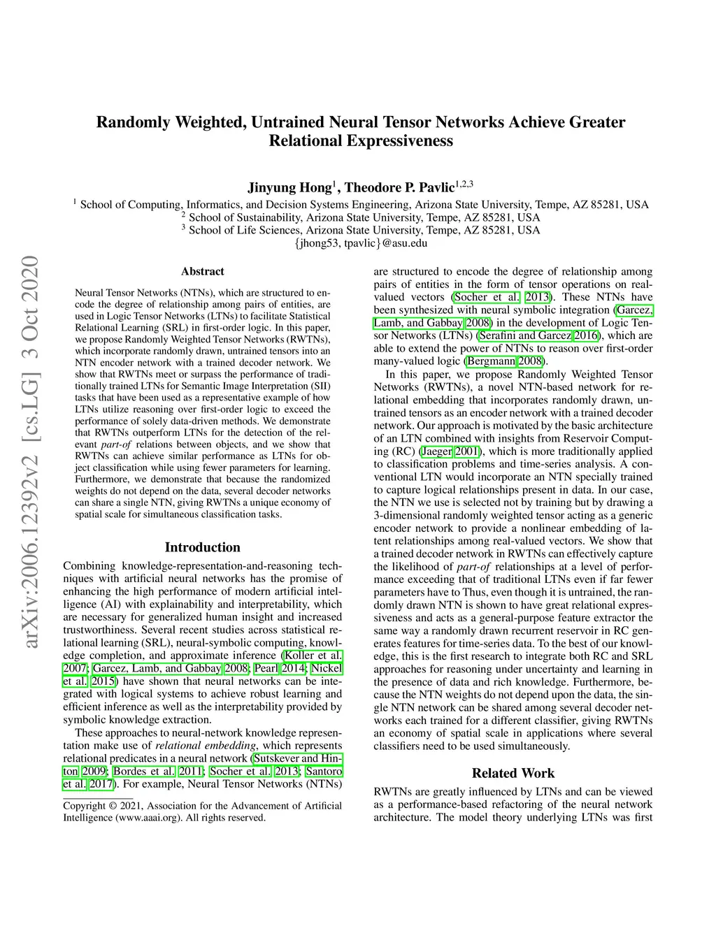 Neural Tensor Networks (NTNs), which are structured to encode the degree of relationship among pairs of entities, are used in Logic Tensor Networks (LTNs) to facilitate Statistical Relational Learning (SRL) in first-order logic. In this paper, we propose Randomly Weighted Tensor Networks (RWTNs), which incorporate randomly drawn, untrained tensors into an NTN encoder network with a trained decoder network. We show that RWTNs meet or surpass the performance of traditionally trained LTNs for Semantic Image Interpretation (SII) tasks that have been used as a representative example of how LTNs utilize reasoning over first-order logic to exceed the performance of solely data-driven methods. We demonstrate that RWTNs outperform LTNs for the detection of the relevant part-of relations between objects, and we show that RWTNs can achieve similar performance as LTNs for object classification while using fewer parameters for learning.