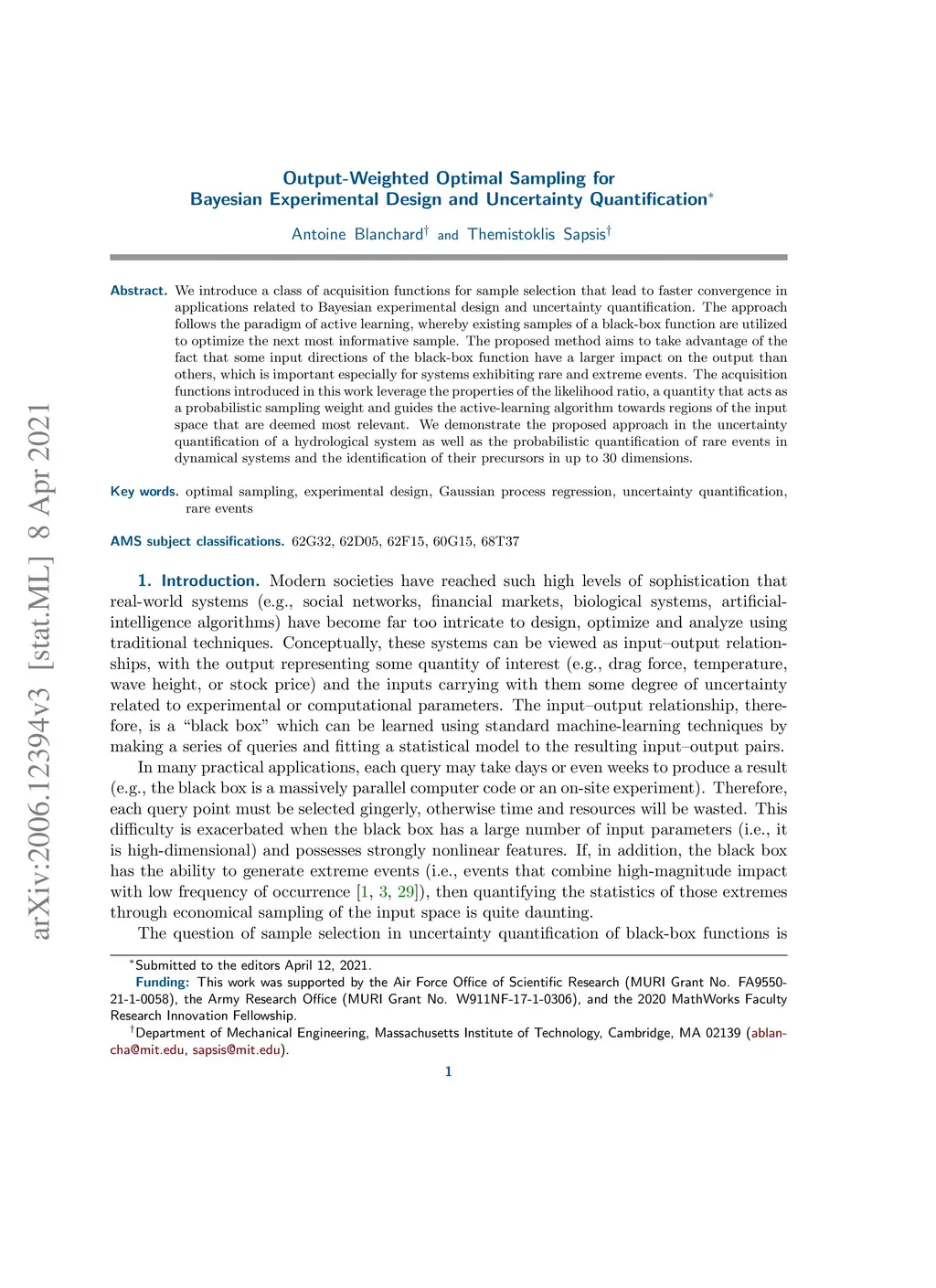 We introduce a class of acquisition functions for sample selection that leads to faster convergence in applications related to Bayesian experimental design and uncertainty quantification. The approach follows the paradigm of active learning, whereby existing samples of a black-box function are utilized to optimize the next most informative sample. The proposed method aims to take advantage of the fact that some input directions of the black-box function have a larger impact on the output than others, which is important especially for systems exhibiting rare and extreme events. The acquisition functions introduced in this work leverage the properties of the likelihood ratio, a quantity that acts as a probabilistic sampling weight and guides the active-learning algorithm towards regions of the input space that are deemed most relevant. We demonstrate superiority of the proposed approach in the uncertainty quantification of a hydrological system as well as the probabilistic quantification of rare events in dynamical systems and the identification of their precursors.