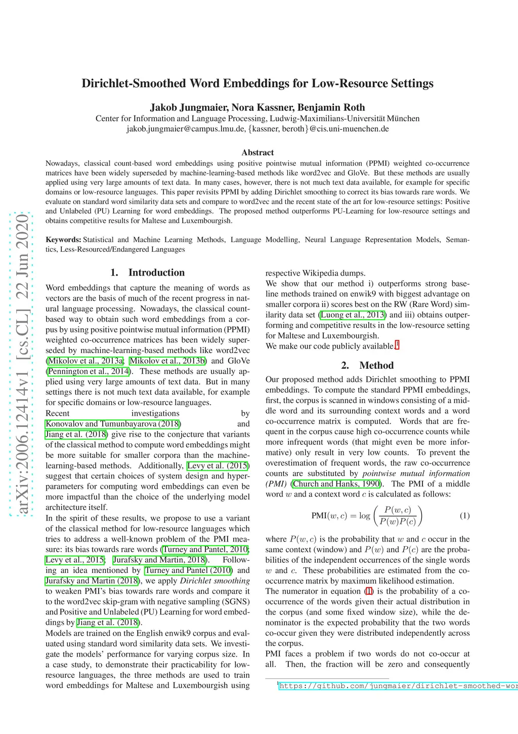 Nowadays, classical count-based word embeddings using positive pointwise mutual information (PPMI) weighted co-occurrence matrices have been widely superseded by machine-learning-based methods like word2vec and GloVe. But these methods are usually applied using very large amounts of text data. In many cases, however, there is not much text data available, for example for specific domains or low-resource languages. This paper revisits PPMI by adding Dirichlet smoothing to correct its bias towards rare words. We evaluate on standard word similarity data sets and compare to word2vec and the recent state of the art for low-resource settings: Positive and Unlabeled (PU) Learning for word embeddings. The proposed method outperforms PU-Learning for low-resource settings and obtains competitive results for Maltese and Luxembourgish.