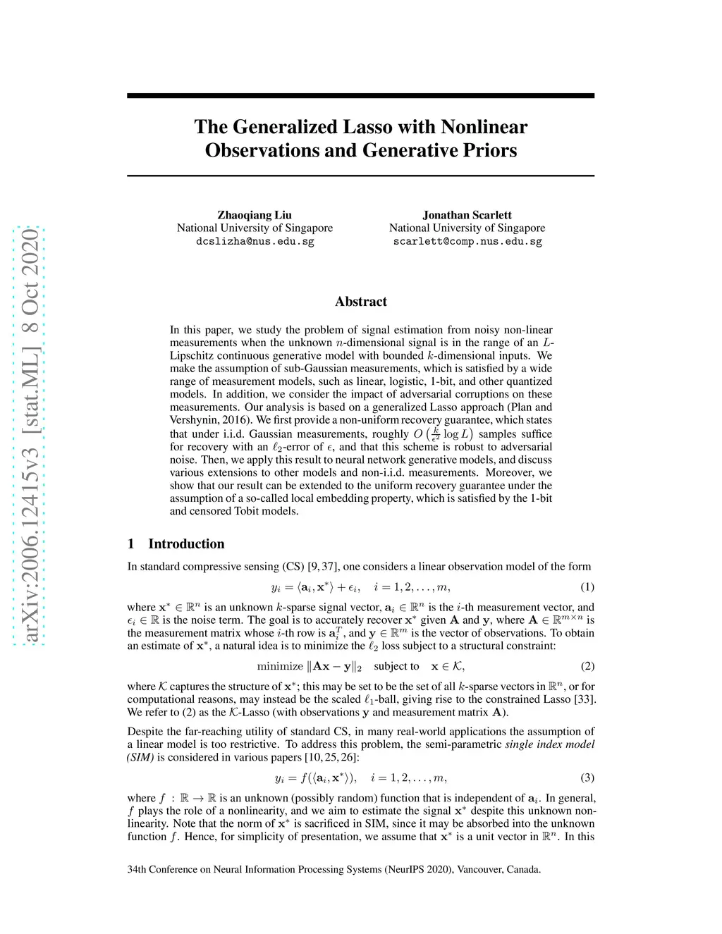 In this paper, we study the problem of signal estimation from noisy non-linear measurements when the unknown -dimensional signal is in the range of an -Lipschitz continuous generative model with bounded -dimensional inputs. We make the assumption of sub-Gaussian measurements, which is satisfied by a wide range of measurement models, such as linear, logistic, 1-bit, and other quantized models. In addition, we consider the impact of adversarial corruptions on these measurements. Our analysis is based on a generalized Lasso approach (Plan and Vershynin, 2016). We first provide a non-uniform recovery guarantee, which states that under i.i.d.~Gaussian measurements, roughly samples suffice for recovery with an -error of , and that this scheme is robust to adversarial noise. Then, we apply this result to neural network generative models, and discuss various extensions to other models and non-i.i.d.~measurements. Moreover, we show that our result can be extended to the uniform recovery guarantee under the assumption of a so-called local embedding property, which is satisfied by the 1-bit and censored Tobit models.