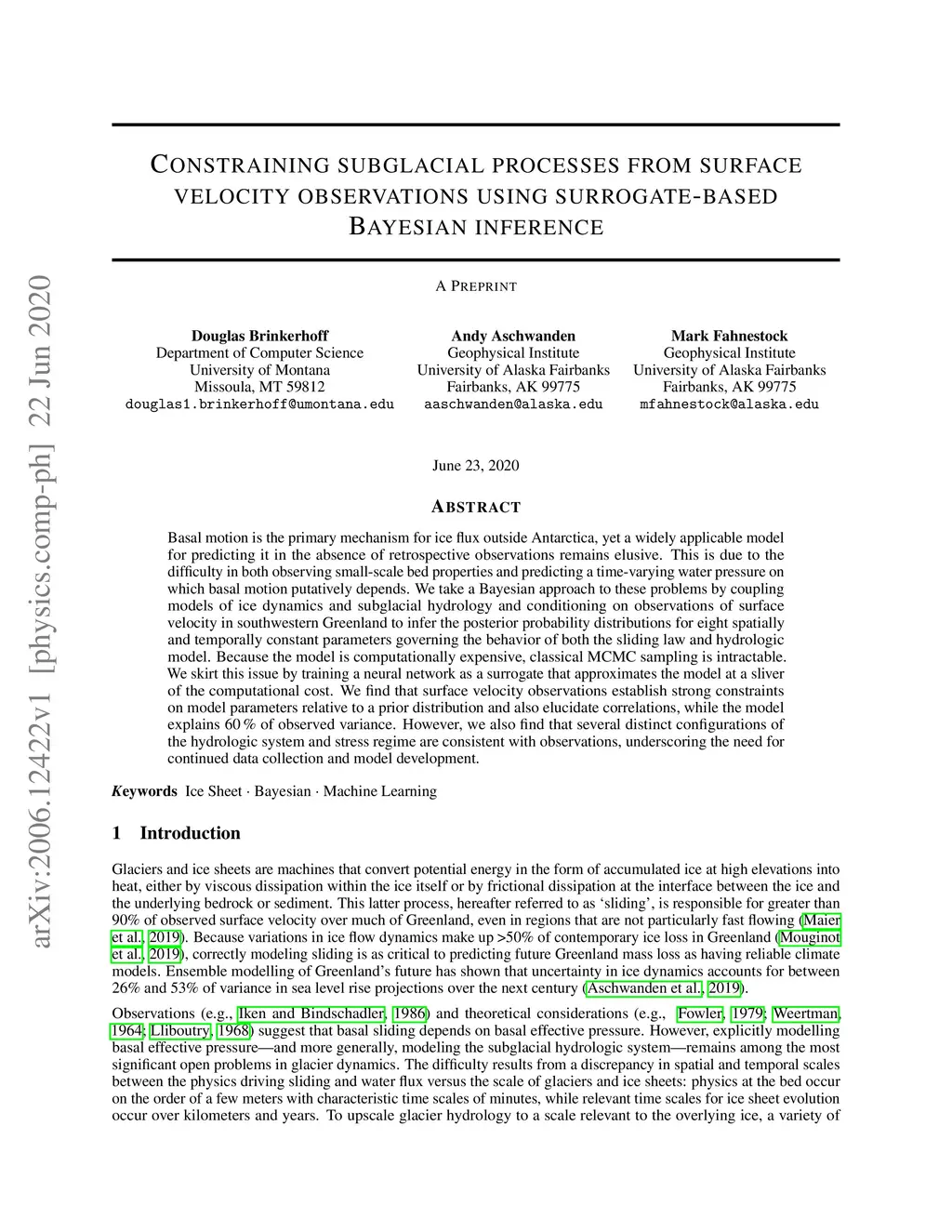 Basal motion is the primary mechanism for ice flux outside Antarctica, yet a widely applicable model for predicting it in the absence of retrospective observations remains elusive. This is due to the difficulty in both observing small-scale bed properties and predicting a time-varying water pressure on which basal motion putatively depends. We take a Bayesian approach to these problems by coupling models of ice dynamics and subglacial hydrology and conditioning on observations of surface velocity in southwestern Greenland to infer the posterior probability distributions for eight spatially and temporally constant parameters governing the behavior of both the sliding law and hydrologic model. Because the model is computationally expensive, classical MCMC sampling is intractable. We skirt this issue by training a neural network as a surrogate that approximates the model at a sliver of the computational cost. We find that surface velocity observations establish strong constraints on model parameters relative to a prior distribution and also elucidate correlations, while the model explains 60% of observed variance. However, we also find that several distinct configurations of the hydrologic system and stress regime are consistent with observations, underscoring the need for continued data collection and model development.