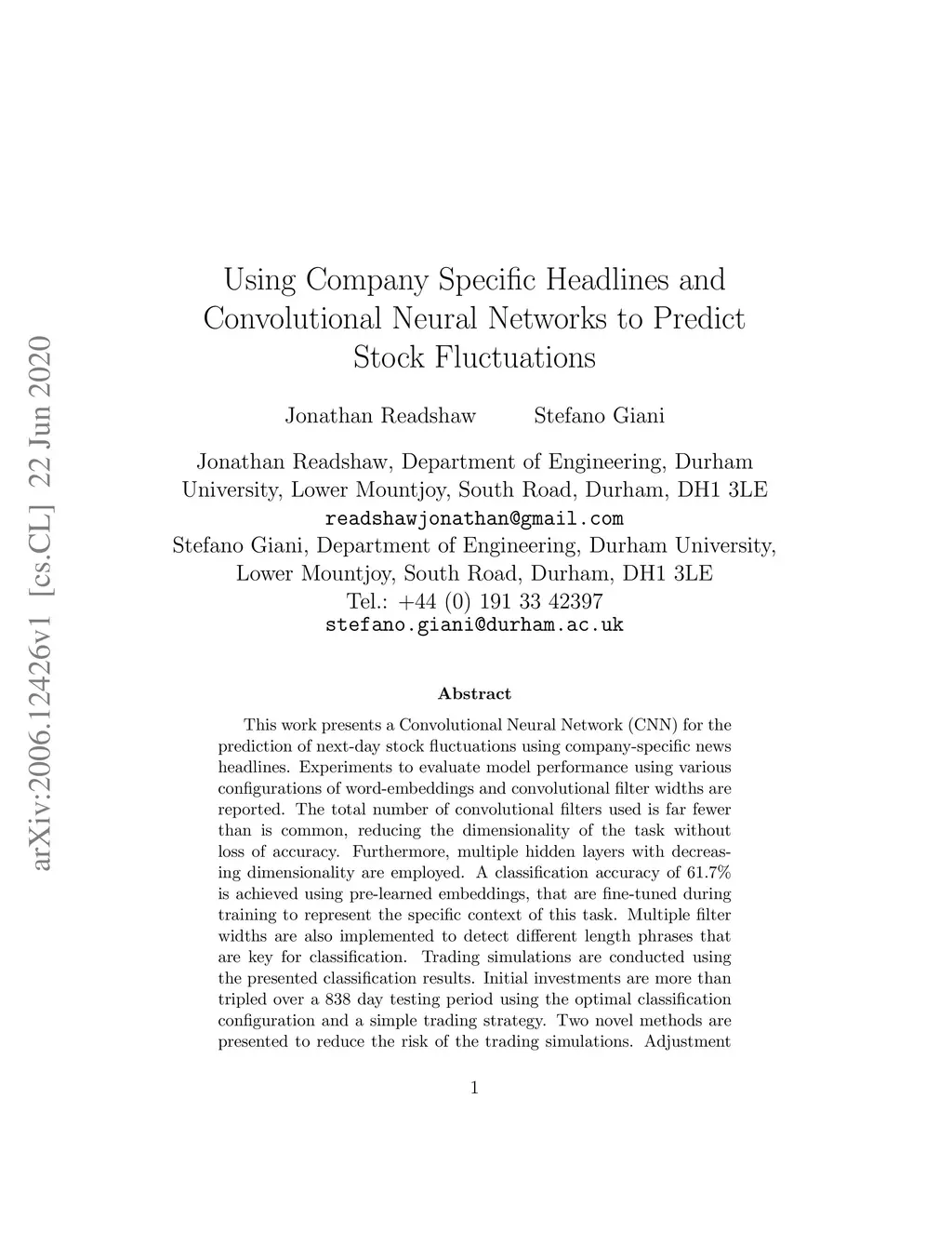 This work presents a Convolutional Neural Network (CNN) for the prediction of next-day stock fluctuations using company-specific news headlines. Experiments to evaluate model performance using various configurations of word-embeddings and convolutional filter widths are reported. The total number of convolutional filters used is far fewer than is common, reducing the dimensionality of the task without loss of accuracy. Furthermore, multiple hidden layers with decreasing dimensionality are employed. A classification accuracy of 61.7\% is achieved using pre-learned embeddings, that are fine-tuned during training to represent the specific context of this task. Multiple filter widths are also implemented to detect different length phrases that are key for classification. Trading simulations are conducted using the presented classification results. Initial investments are more than tripled over a 838 day testing period using the optimal classification configuration and a simple trading strategy. Two novel methods are presented to reduce the risk of the trading simulations. Adjustment of the sigmoid class threshold and re-labelling headlines using multiple classes form the basis of these methods. A combination of these approaches is found to more than double the Average Trade Profit (ATP) achieved during baseline simulations.