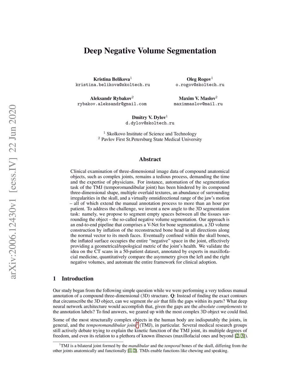 Clinical examination of three-dimensional image data of compound anatomical objects, such as complex joints, remains a tedious process, demanding the time and the expertise of physicians. For instance, automation of the segmentation task of the TMJ (temporomandibular joint) has been hindered by its compound three-dimensional shape, multiple overlaid textures, an abundance of surrounding irregularities in the skull, and a virtually omnidirectional range of the jaw's motion - all of which extend the manual annotation process to more than an hour per patient. To address the challenge, we invent a new angle to the 3D segmentation task: namely, we propose to segment empty spaces between all the tissues surrounding the object - the so-called negative volume segmentation. Our approach is an end-to-end pipeline that comprises a V-Net for bone segmentation, a 3D volume construction by inflation of the reconstructed bone head in all directions along the normal vector to its mesh faces. Eventually confined within the skull bones, the inflated surface occupies the entire "negative" space in the joint, effectively providing a geometrical/topological metric of the joint's health. We validate the idea on the CT scans in a 50-patient dataset, annotated by experts in maxillofacial medicine, quantitatively compare the asymmetry given the left and the right negative volumes, and automate the entire framework for clinical adoption.