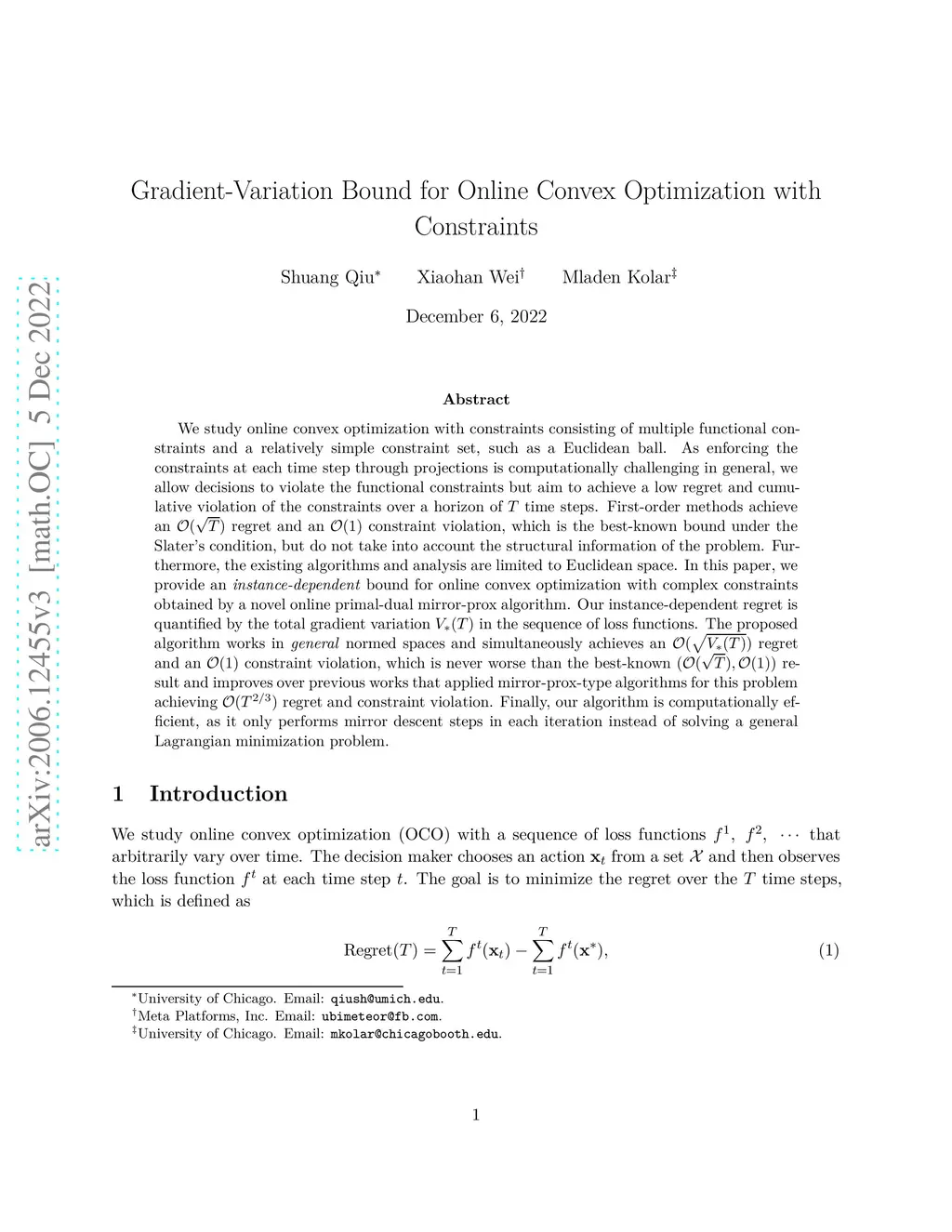 We study online convex optimization with constraints consisting of multiple functional constraints and a relatively simple constraint set, such as a Euclidean ball. As enforcing the constraints at each time step through projections is computationally challenging in general, we allow decisions to violate the functional constraints but aim to achieve a low regret and cumulative violation of the constraints over a horizon of time steps. First-order methods achieve an regret and an constraint violation, which is the best-known bound under the Slater's condition, but do not take into account the structural information of the problem. Furthermore, the existing algorithms and analysis are limited to Euclidean space. In this paper, we provide an \emph{instance-dependent} bound for online convex optimization with complex constraints obtained by a novel online primal-dual mirror-prox algorithm. Our instance-dependent regret is quantified by the total gradient variation in the sequence of loss functions. The proposed algorithm works in \emph{general} normed spaces and simultaneously achieves an regret and an constraint violation, which is never worse than the best-known result and improves over previous works that applied mirror-prox-type algorithms for this problem achieving regret and constraint violation. Finally, our algorithm is computationally efficient, as it only performs mirror descent steps in each iteration instead of solving a general Lagrangian minimization problem.