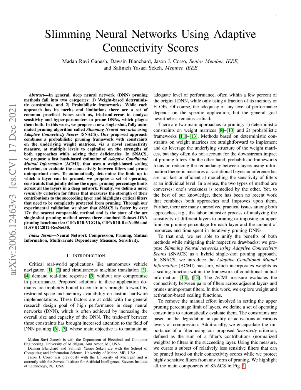 In general, deep neural network (DNN) pruning methods fall into two categories: 1) Weight-based deterministic constraints, and 2) Probabilistic frameworks. While each approach has its merits and limitations there are a set of common practical issues such as, trial-and-error to analyze sensitivity and hyper-parameters to prune DNNs, which plague them both. In this work, we propose a new single-shot, fully automated pruning algorithm called Slimming Neural networks using Adaptive Connectivity Scores (SNACS). Our proposed approach combines a probabilistic pruning framework with constraints on the underlying weight matrices, via a novel connectivity measure, at multiple levels to capitalize on the strengths of both approaches while solving their deficiencies. In \alg{}, we propose a fast hash-based estimator of Adaptive Conditional Mutual Information (ACMI), that uses a weight-based scaling criterion, to evaluate the connectivity between filters and prune unimportant ones. To automatically determine the limit up to which a layer can be pruned, we propose a set of operating constraints that jointly define the upper pruning percentage limits across all the layers in a deep network. Finally, we define a novel sensitivity criterion for filters that measures the strength of their contributions to the succeeding layer and highlights critical filters that need to be completely protected from pruning. Through our experimental validation we show that SNACS is faster by over 17x the nearest comparable method and is the state of the art single-shot pruning method across three standard Dataset-DNN pruning benchmarks: CIFAR10-VGG16, CIFAR10-ResNet56 and ILSVRC2012-ResNet50.