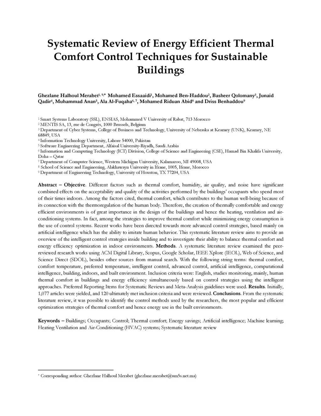 Different factors such as thermal comfort, humidity, air quality, and noise have significant combined effects on the acceptability and quality of the activities performed by the building occupants who spend most of their times indoors. Among the factors cited, thermal comfort, which contributes to the human well-being because of its connection with the thermoregulation of the human body. Therefore, the creation of thermally comfortable and energy efficient environments is of great importance in the design of the buildings and hence the heating, ventilation and air-conditioning systems. Recent works have been directed towards more advanced control strategies, based mainly on artificial intelligence which has the ability to imitate human behavior. This systematic literature review aims to provide an overview of the intelligent control strategies inside building and to investigate their ability to balance thermal comfort and energy efficiency optimization in indoor environments. Methods. A systematic literature review examined the peer-reviewed research works using ACM Digital Library, Scopus, Google Scholar, IEEE Xplore (IEOL), Web of Science, and Science Direct (SDOL), besides other sources from manual search. With the following string terms: thermal comfort, comfort temperature, preferred temperature, intelligent control, advanced control, artificial intelligence, computational intelligence, building, indoors, and built environment. Inclusion criteria were: English, studies monitoring, mainly, human thermal comfort in buildings and energy efficiency simultaneously based on control strategies using the intelligent approaches. Preferred Reporting Items for Systematic Reviews and Meta-Analysis guidelines were used. Initially, 1,077 articles were yielded, and 120 ultimately met inclusion criteria and were reviewed.