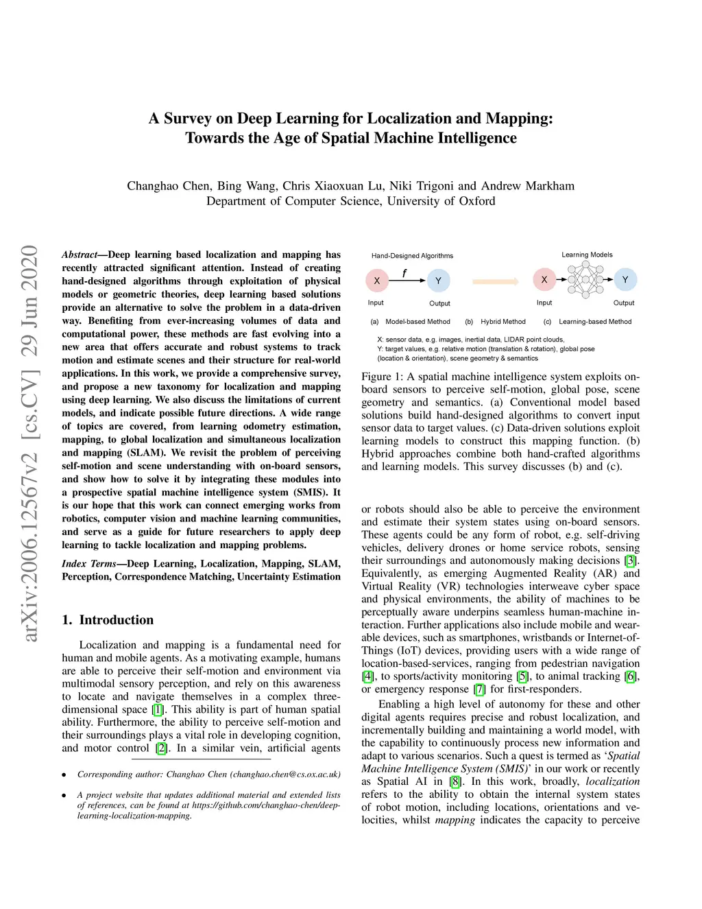 Deep learning based localization and mapping has recently attracted significant attention. Instead of creating hand-designed algorithms through exploitation of physical models or geometric theories, deep learning based solutions provide an alternative to solve the problem in a data-driven way. Benefiting from ever-increasing volumes of data and computational power, these methods are fast evolving into a new area that offers accurate and robust systems to track motion and estimate scenes and their structure for real-world applications. In this work, we provide a comprehensive survey, and propose a new taxonomy for localization and mapping using deep learning. We also discuss the limitations of current models, and indicate possible future directions. A wide range of topics are covered, from learning odometry estimation, mapping, to global localization and simultaneous localization and mapping (SLAM). We revisit the problem of perceiving self-motion and scene understanding with on-board sensors, and show how to solve it by integrating these modules into a prospective spatial machine intelligence system (SMIS). It is our hope that this work can connect emerging works from robotics, computer vision and machine learning communities, and serve as a guide for future researchers to apply deep learning to tackle localization and mapping problems.