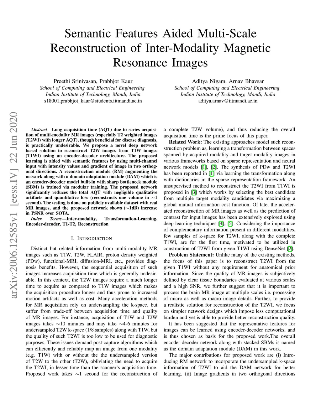 Long acquisition time (AQT) due to series acquisition of multi-modality MR images (especially T2 weighted images (T2WI) with longer AQT), though beneficial for disease diagnosis, is practically undesirable. We propose a novel deep network based solution to reconstruct T2W images from T1W images (T1WI) using an encoder-decoder architecture. The proposed learning is aided with semantic features by using multi-channel input with intensity values and gradient of image in two orthogonal directions. A reconstruction module (RM) augmenting the network along with a domain adaptation module (DAM) which is an encoder-decoder model built-in with sharp bottleneck module (SBM) is trained via modular training. The proposed network significantly reduces the total AQT with negligible qualitative artifacts and quantitative loss (reconstructs one volume in approximately 1 second). The testing is done on publicly available dataset with real MR images, and the proposed network shows (approximately 1dB) increase in PSNR over SOTA.