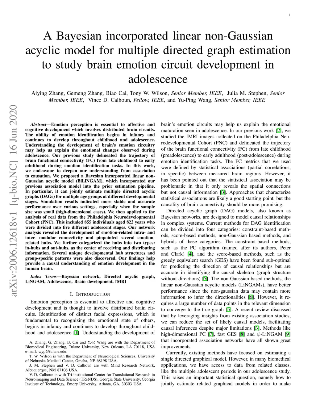 Emotion perception is essential to affective and cognitive development which involves distributed brain circuits. The ability of emotion identification begins in infancy and continues to develop throughout childhood and adolescence. Understanding the development of brain's emotion circuitry may help us explain the emotional changes observed during adolescence. Our previous study delineated the trajectory of brain functional connectivity (FC) from late childhood to early adulthood during emotion identification tasks. In this work, we endeavour to deepen our understanding from association to causation. We proposed a Bayesian incorporated linear non-Gaussian acyclic model (BiLiNGAM), which incorporated our previous association model into the prior estimation pipeline. In particular, it can jointly estimate multiple directed acyclic graphs (DAGs) for multiple age groups at different developmental stages. Simulation results indicated more stable and accurate performance over various settings, especially when the sample size was small (high-dimensional cases). We then applied to the analysis of real data from the Philadelphia Neurodevelopmental Cohort (PNC). This included 855 individuals aged 8-22 years who were divided into five different adolescent stages. Our network analysis revealed the development of emotion-related intra- and inter- modular connectivity and pinpointed several emotion-related hubs. We further categorized the hubs into two types: in-hubs and out-hubs, as the center of receiving and distributing information. Several unique developmental hub structures and group-specific patterns were also discovered. Our findings help provide a causal understanding of emotion development in the human brain.