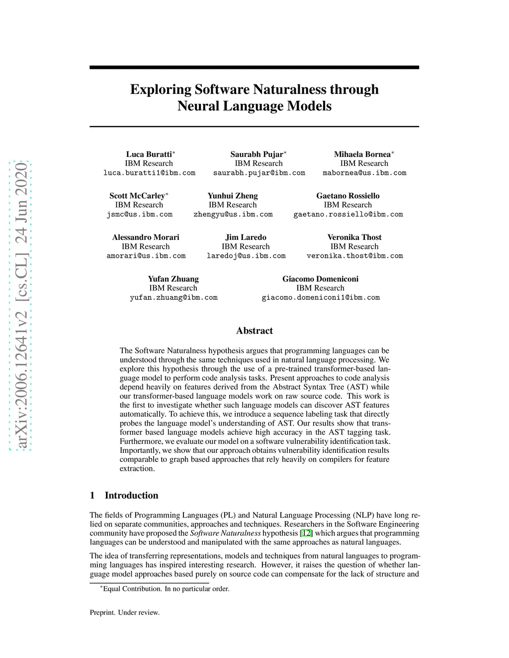 The Software Naturalness hypothesis argues that programming languages can be understood through the same techniques used in natural language processing. We explore this hypothesis through the use of a pre-trained transformer-based language model to perform code analysis tasks. Present approaches to code analysis depend heavily on features derived from the Abstract Syntax Tree (AST) while our transformer-based language models work on raw source code. This work is the first to investigate whether such language models can discover AST features automatically. To achieve this, we introduce a sequence labeling task that directly probes the language models understanding of AST. Our results show that transformer based language models achieve high accuracy in the AST tagging task. Furthermore, we evaluate our model on a software vulnerability identification task. Importantly, we show that our approach obtains vulnerability identification results comparable to graph based approaches that rely heavily on compilers for feature extraction.
