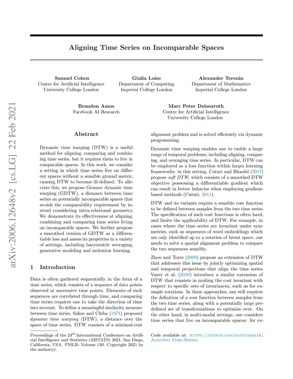 Dynamic time warping (DTW) is a useful method for aligning, comparing and combining time series, but it requires them to live in comparable spaces. In this work, we consider a setting in which time series live on different spaces without a sensible ground metric, causing DTW to become ill-defined. To alleviate this, we propose Gromov dynamic time warping (GDTW), a distance between time series on potentially incomparable spaces that avoids the comparability requirement by instead considering intra-relational geometry. We demonstrate its effectiveness at aligning, combining and comparing time series living on incomparable spaces. We further propose a smoothed version of GDTW as a differentiable loss and assess its properties in a variety of settings, including barycentric averaging, generative modeling and imitation learning.